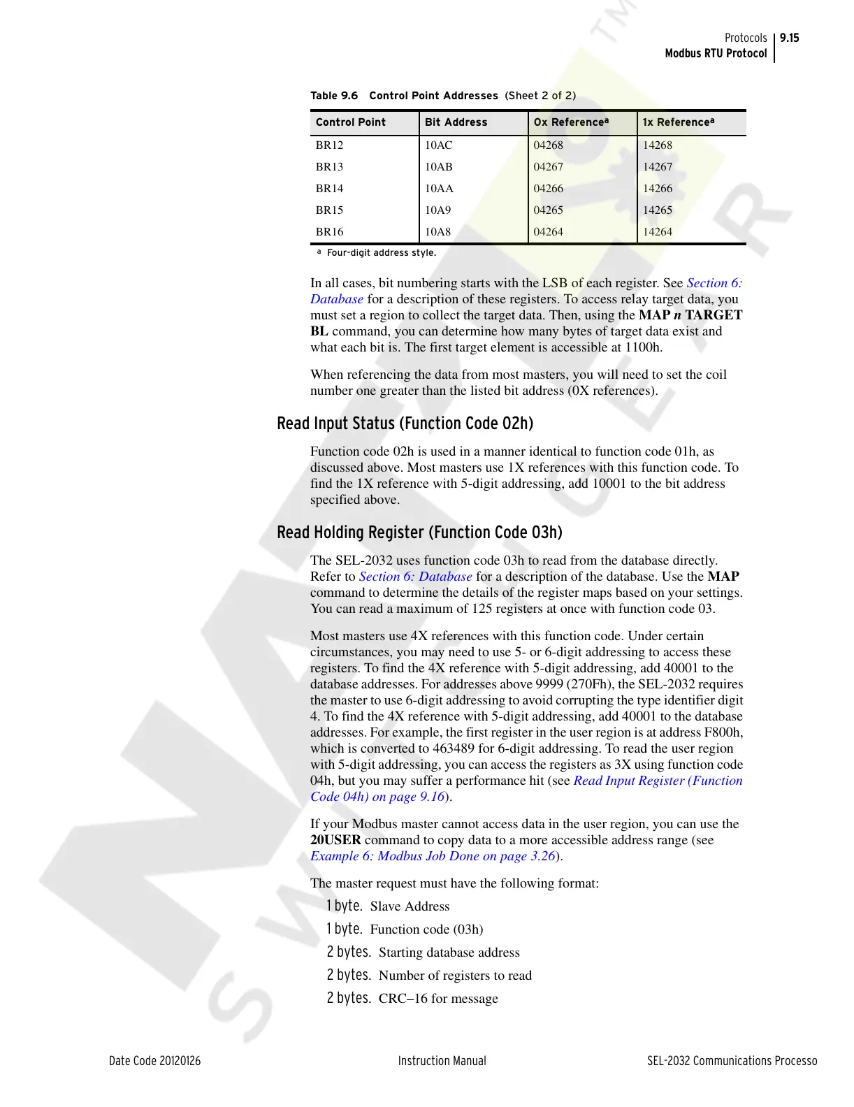 database addresses. For addresses above 9999 (270Fh), the SEL-2032 requires