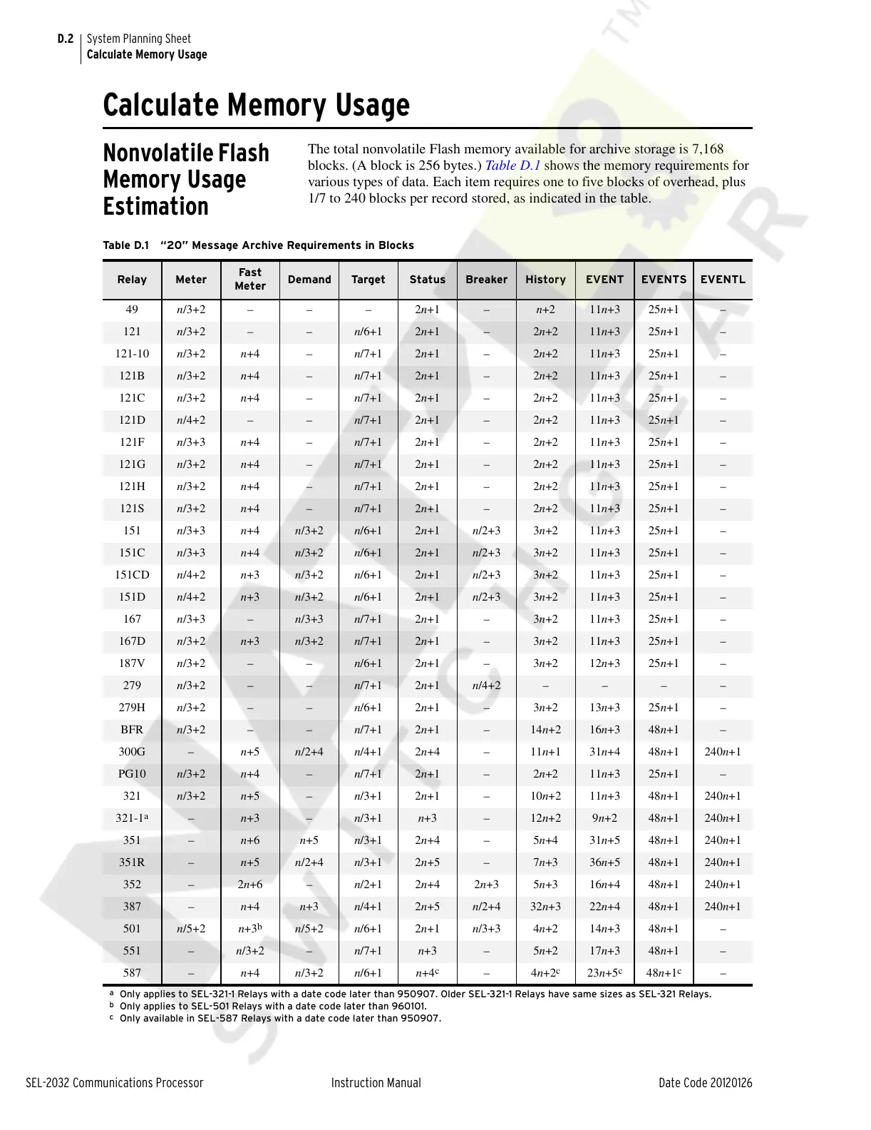 Table D.1 “20” Message Archive Requirements in Blocks