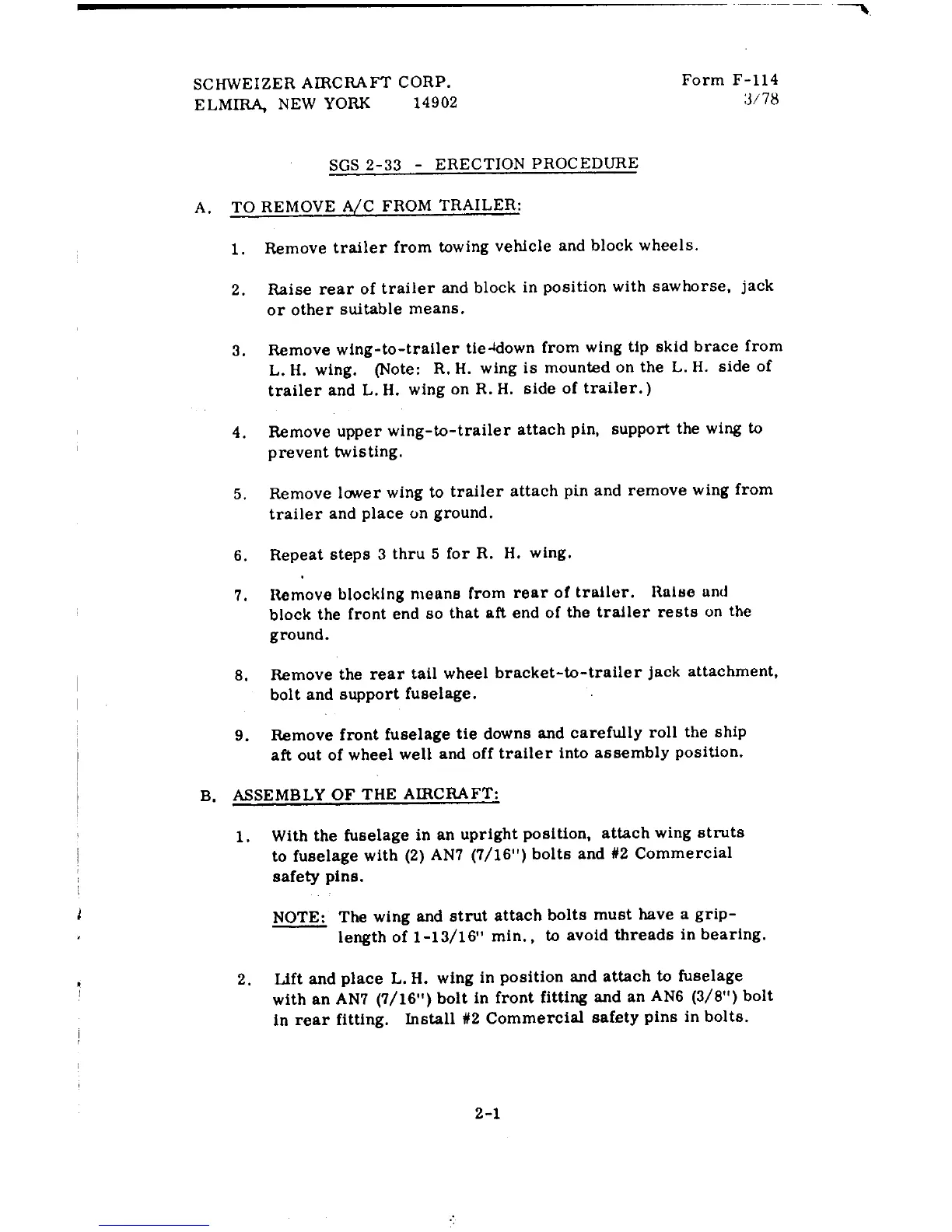 Schweizer SGS 2-33 - Sailplane Assembly Procedures; Trailer Removal and Initial Assembly