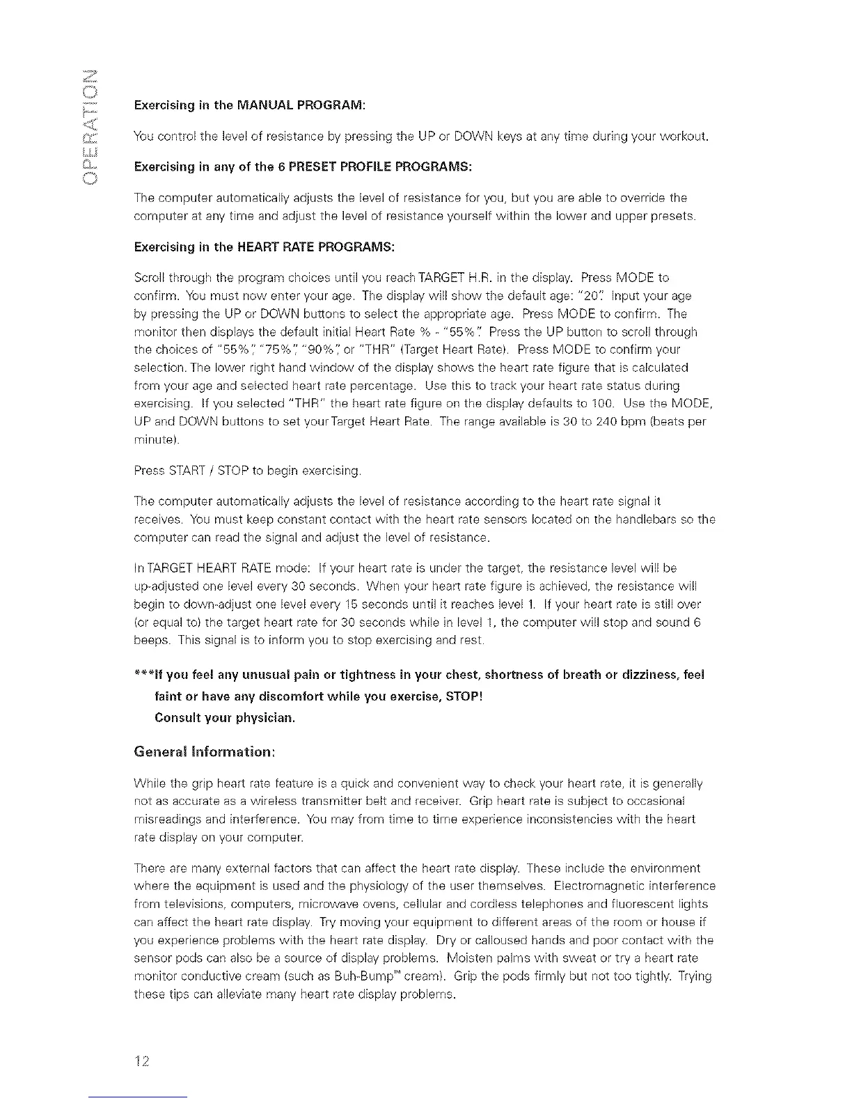 Exercising in any of the 6 PRESET PROFILE PROGRAMS: