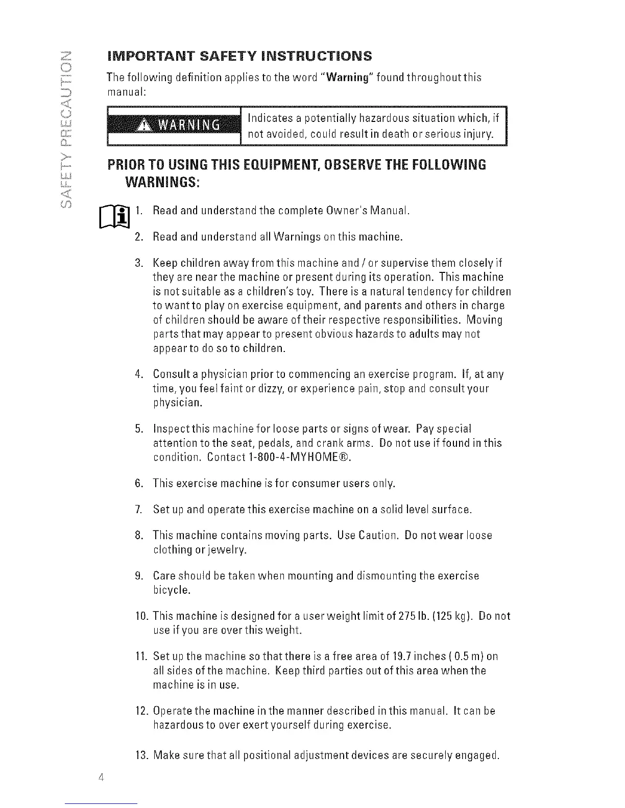 10. This machine is designed for a userweight limit of 275lb. (125 kg). Donot