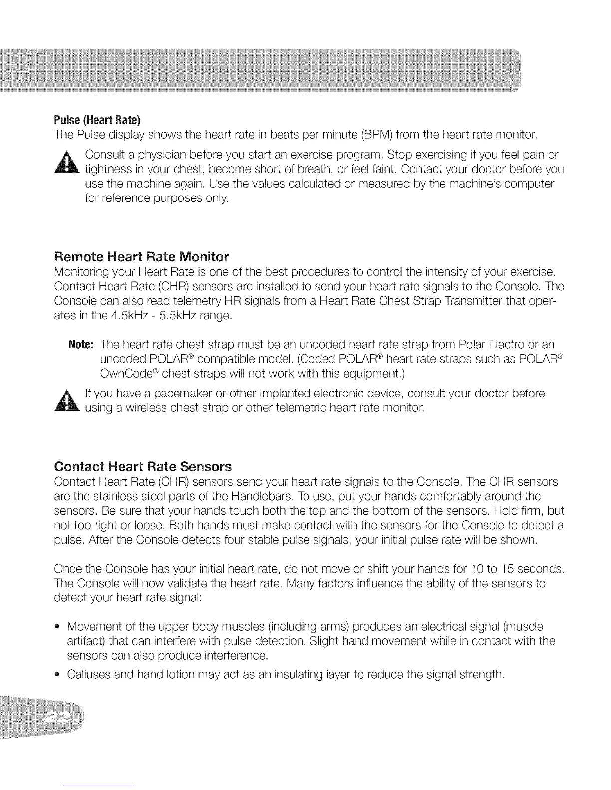 Contact Heart Rate (CHR) sensors send your heart rate signals to the Console. The CHR sensors
