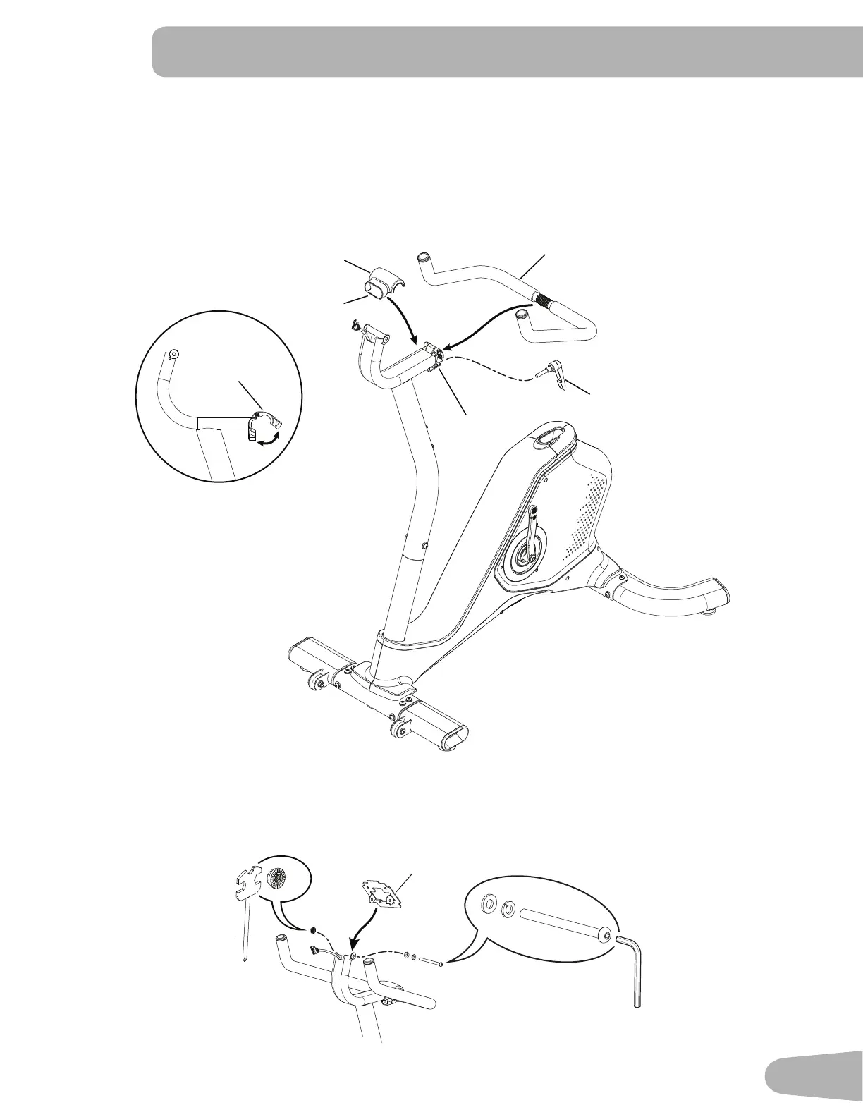 Install the Handlebar Clamp Handle (B) through the holes. Fully tighten the Handle to keep the Handlebar in