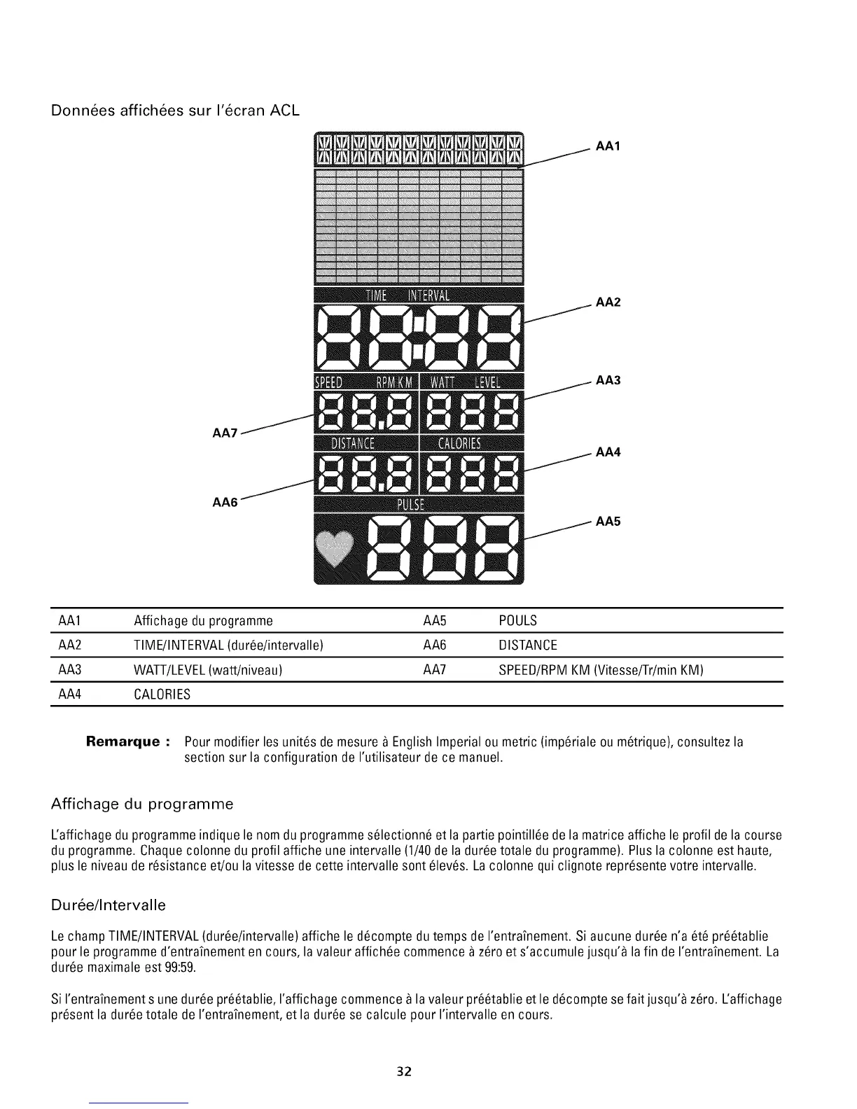 AA3 WATT/LEVEL(watt/niveau) AA7 SPEED/RPMKM (Vitesse/Tr/minKM)