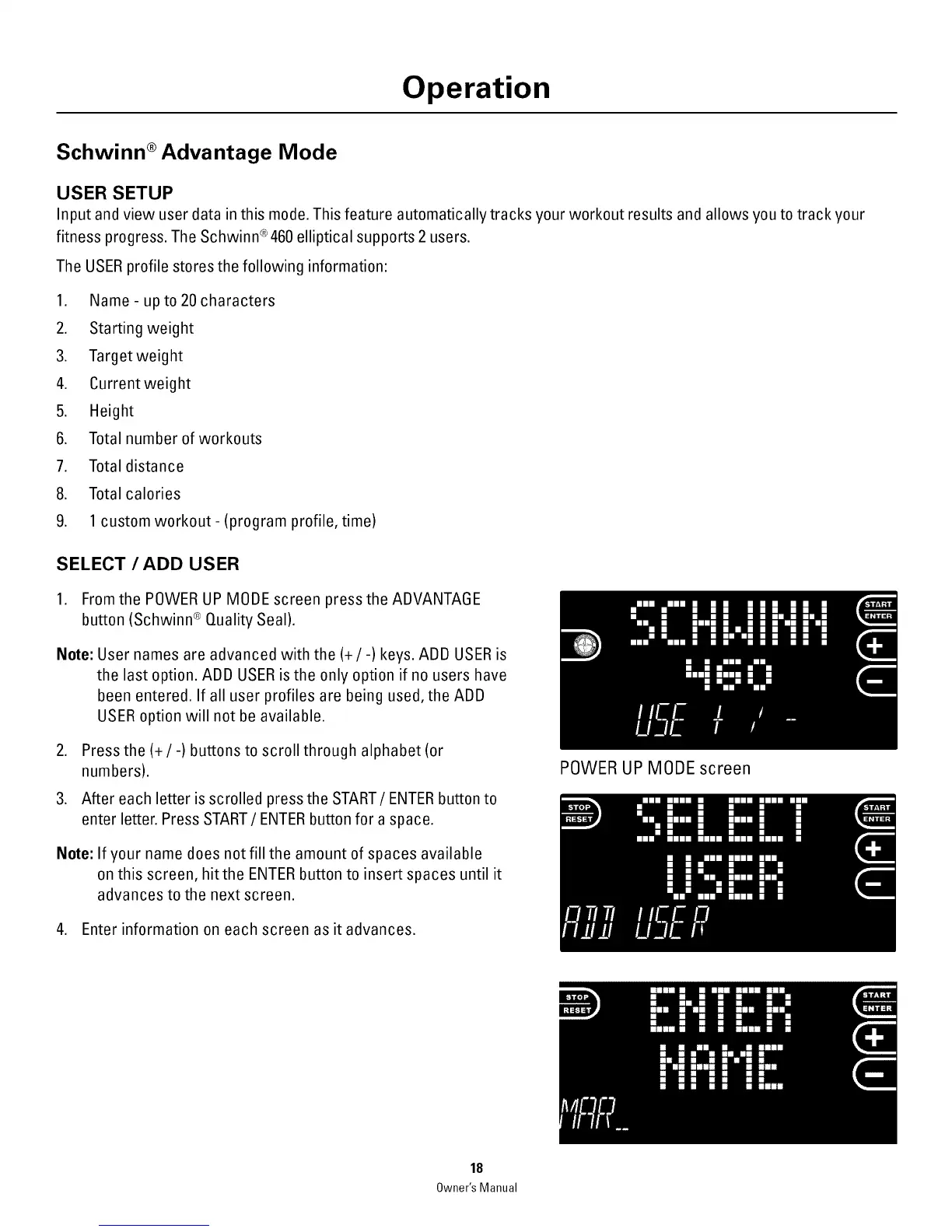 Note: User names are advanced with the (+/-) keys. ADD USERis