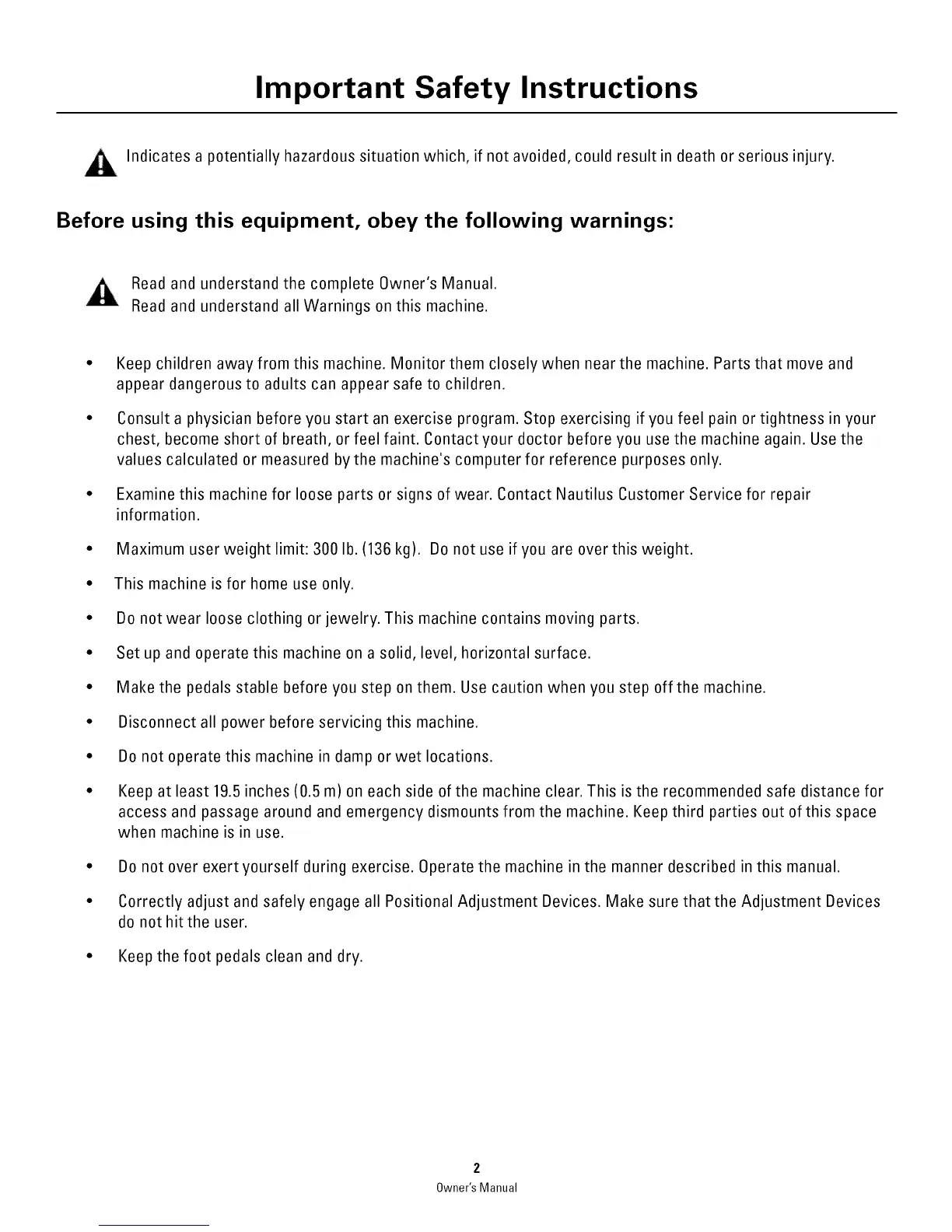 • Examine this machine for loose parts or signs of wear. Contact Nautilus Customer Service for repair