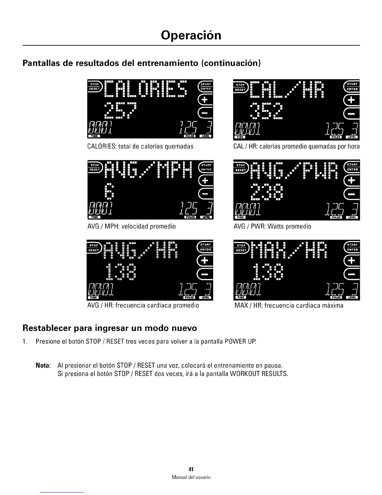 Si presiona el bot6n STOP / RESETdos veces, ir_ a la pantalla WORKOUT RESULTS.