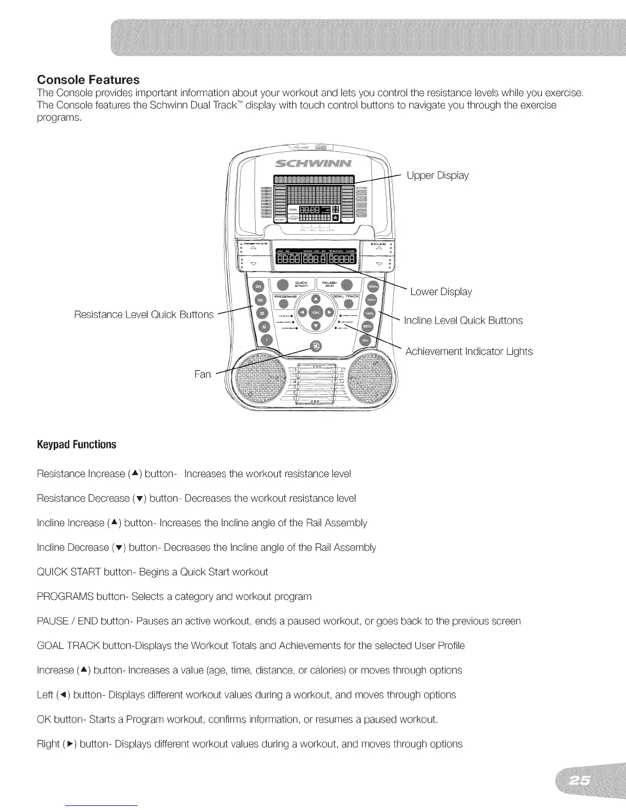 The Console features the Schwinn Dual TrackTM display with touch control buttons to navigate you through the exercise