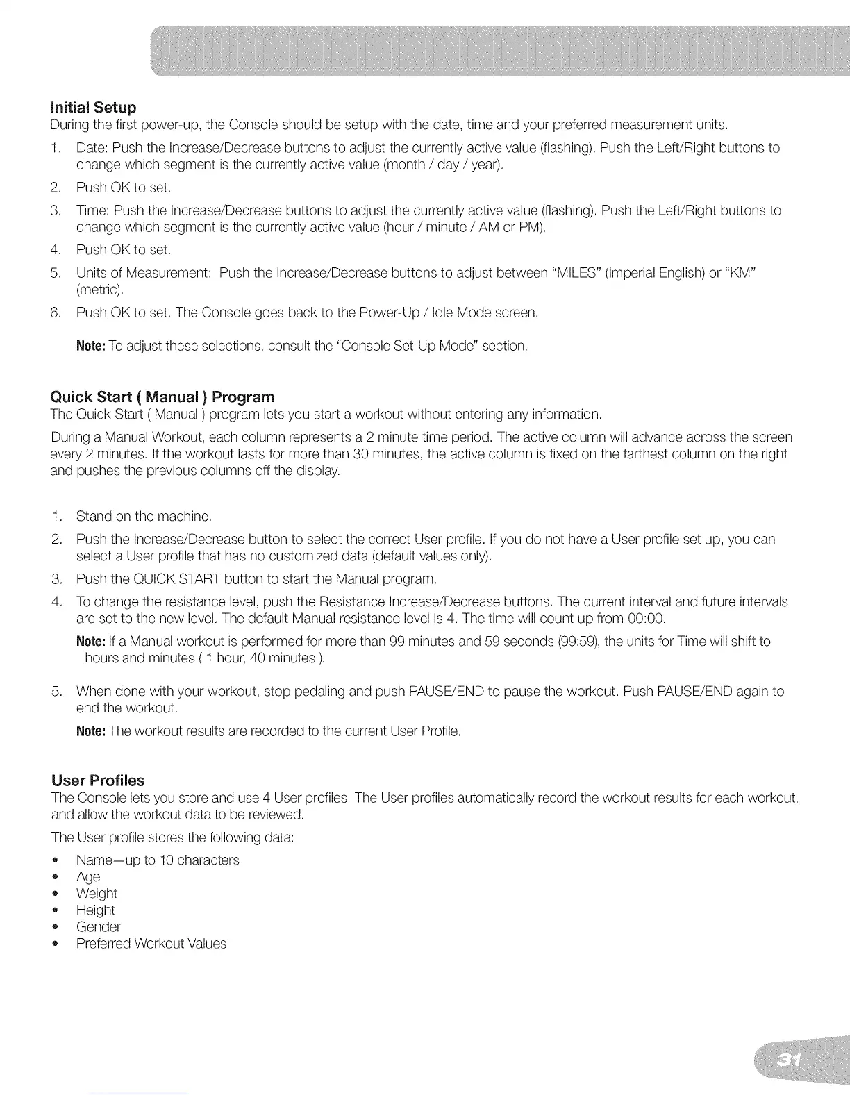 The Quick Start ( Manual ) program lets you start a workout without entering any information.