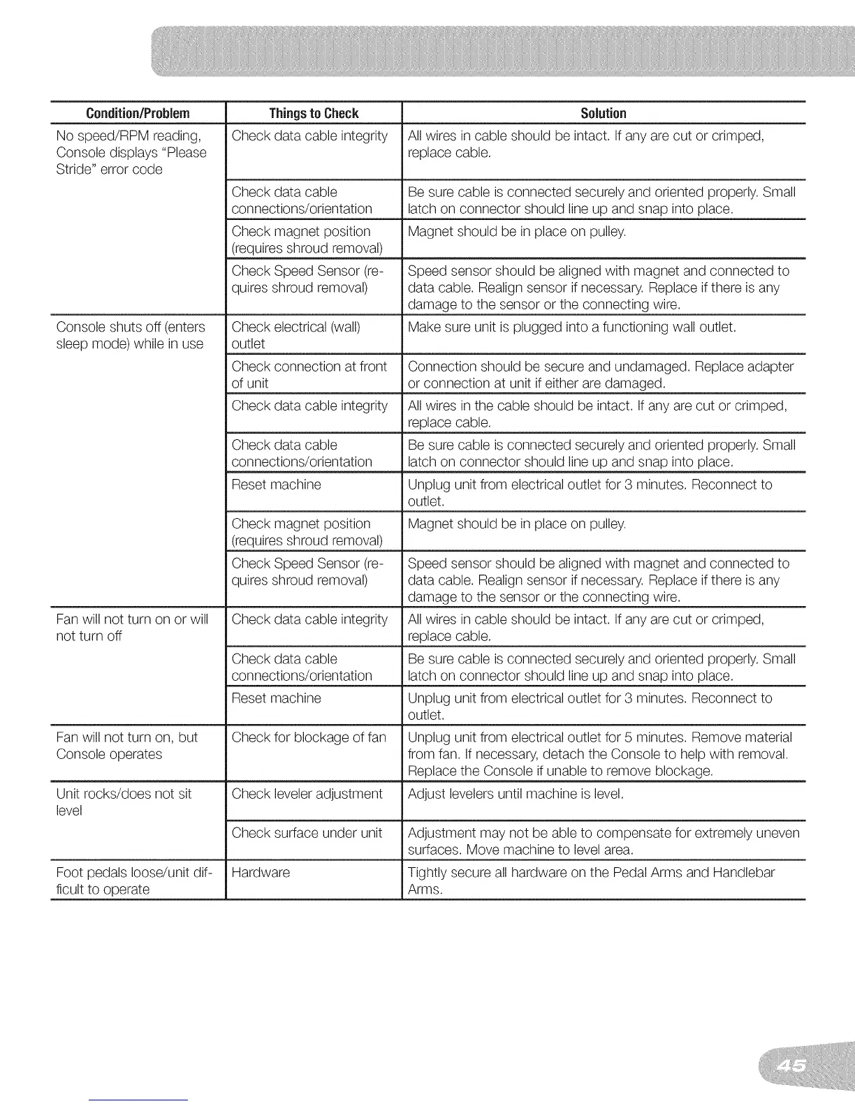 Foot pedals loose/unit dif- Hardware Tightly secure all hardware on the Pedal Arms and Handlebar