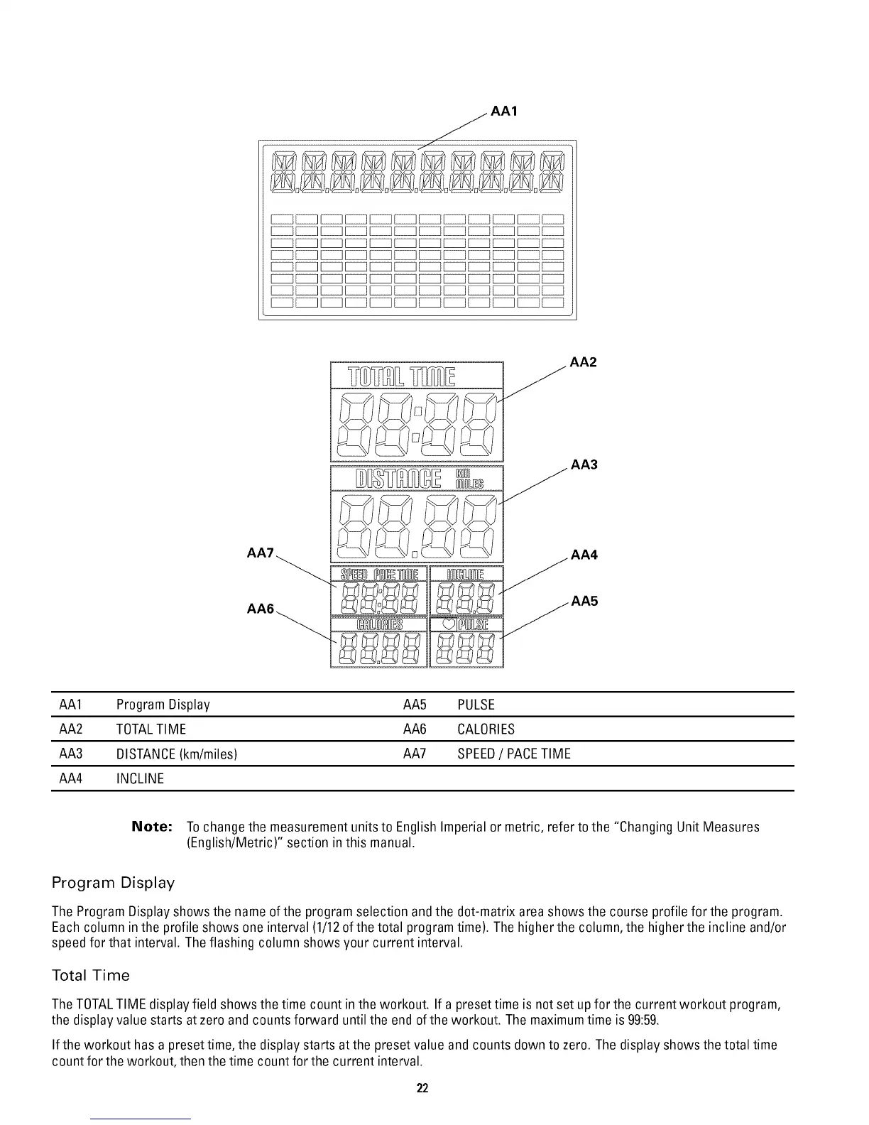 TheTOTALTIME display field shows the time count in the workout. If a preset time is notset up for the current workout program,