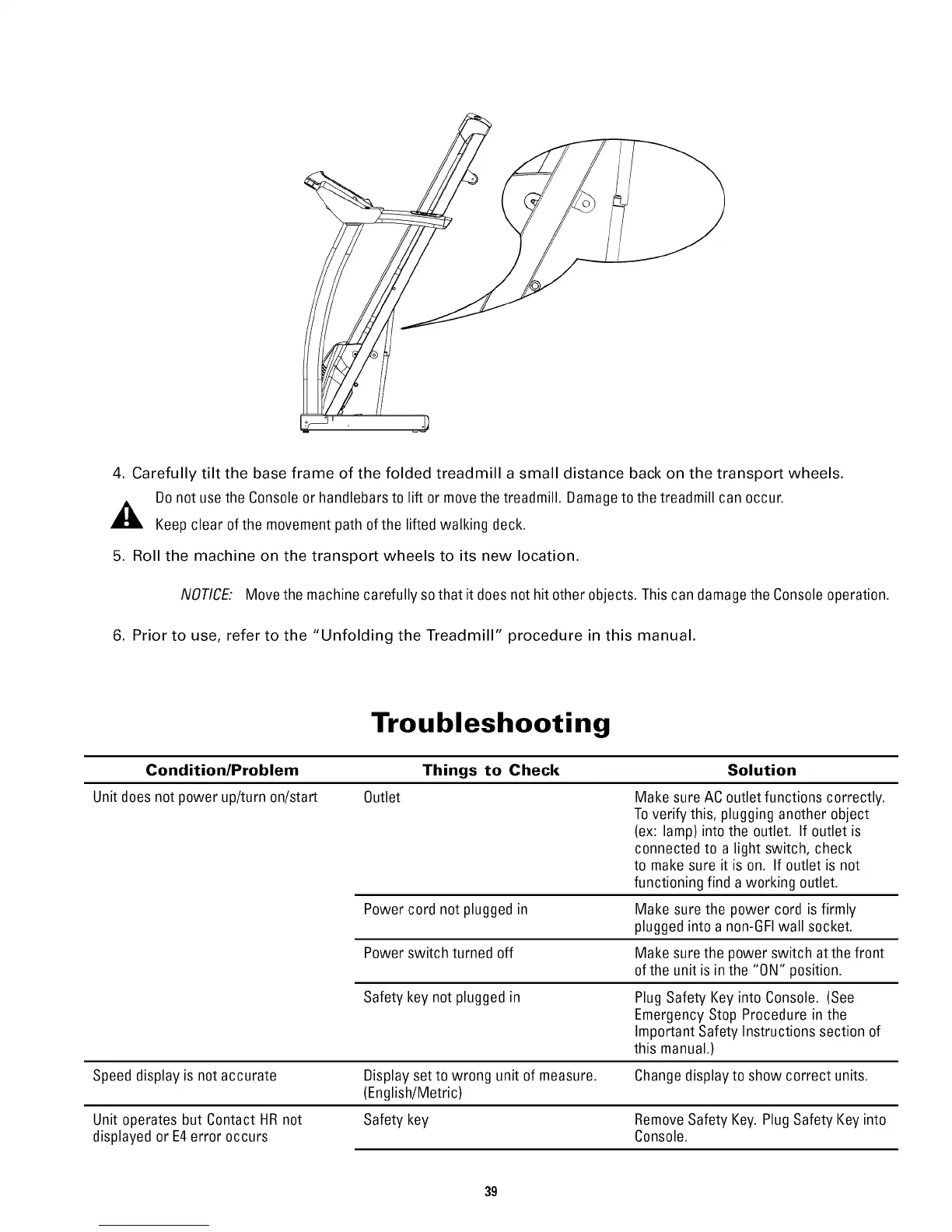 Donot usethe Consoleor handlebarsto lift or movethe treadmill. Damageto the treadmill can occur.