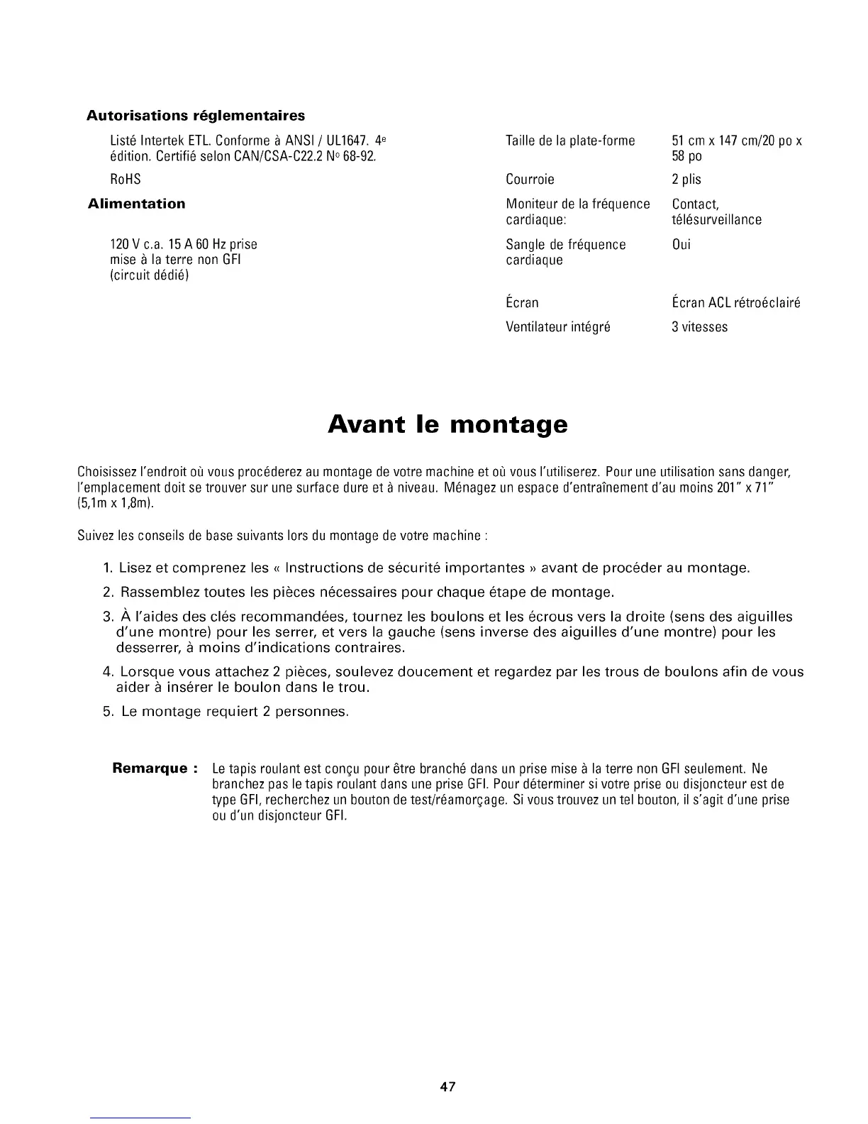 I'emplacement doit setrouver sur une surface dure et _ niveau. M6nagez un espace d'entrafnement d'au moins 201" x 71"