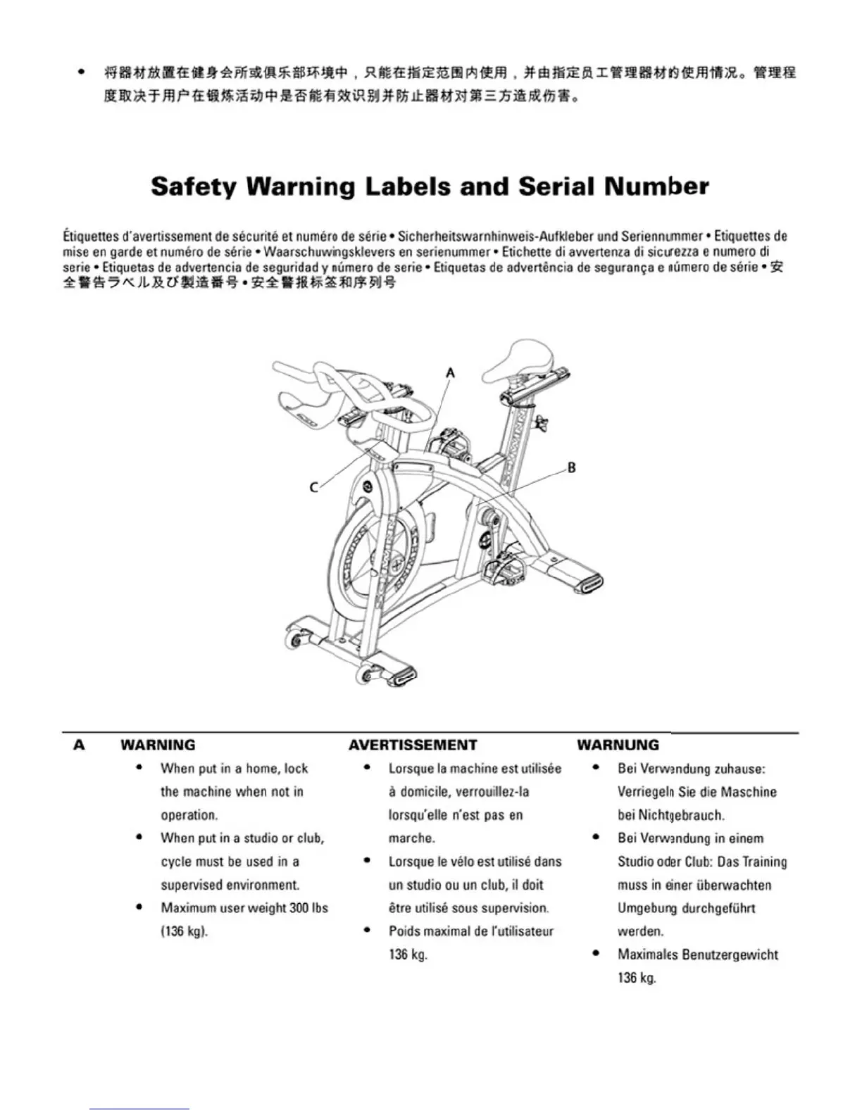 Schwinn A.C. Performance Plus - Safety Warning Labels and Serial Number; Safety Warnings