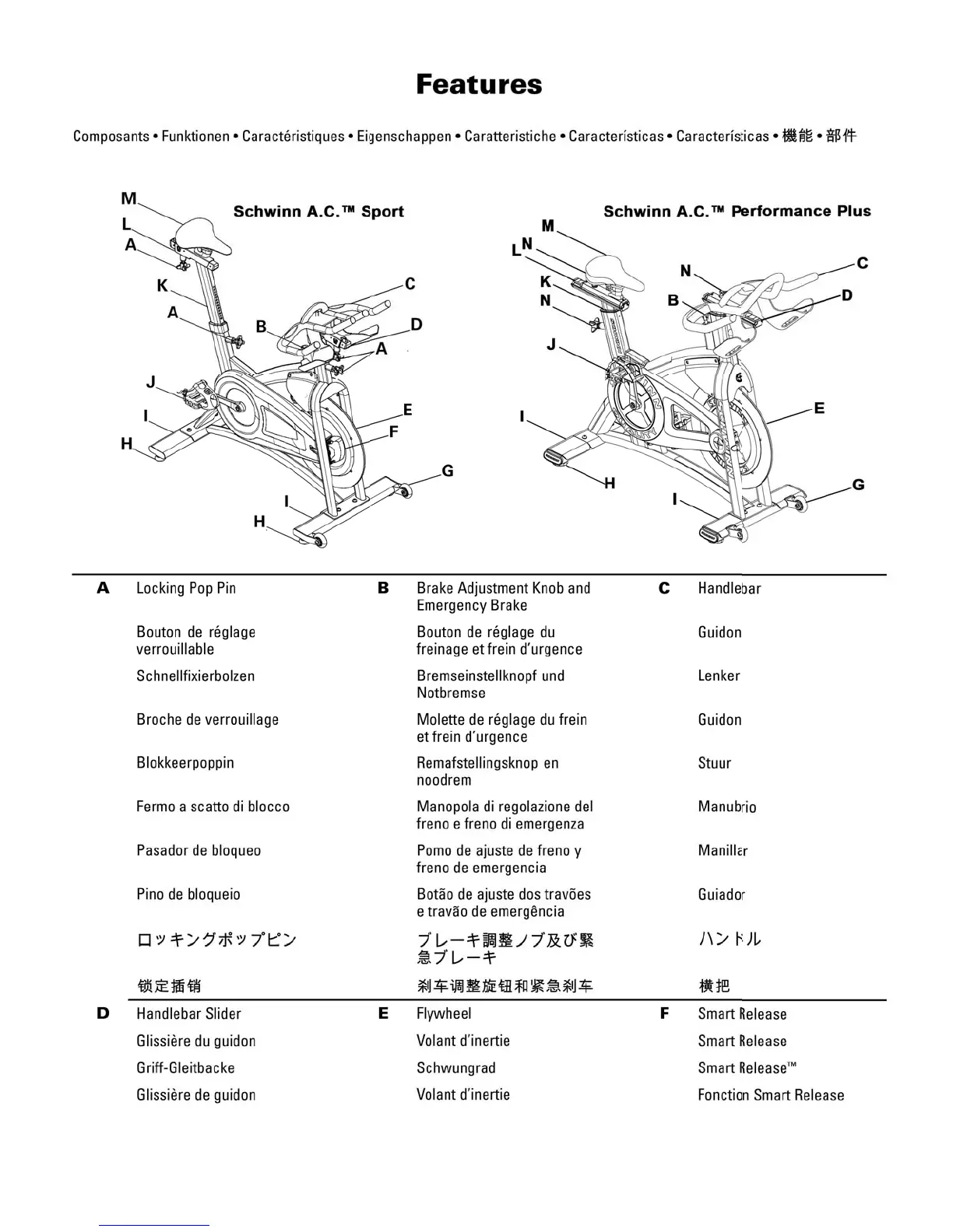 Schwinn A.C. Performance Plus - Features; Locking Pop Pins; Brake Adjustment Knob; Smart Release Mechanism