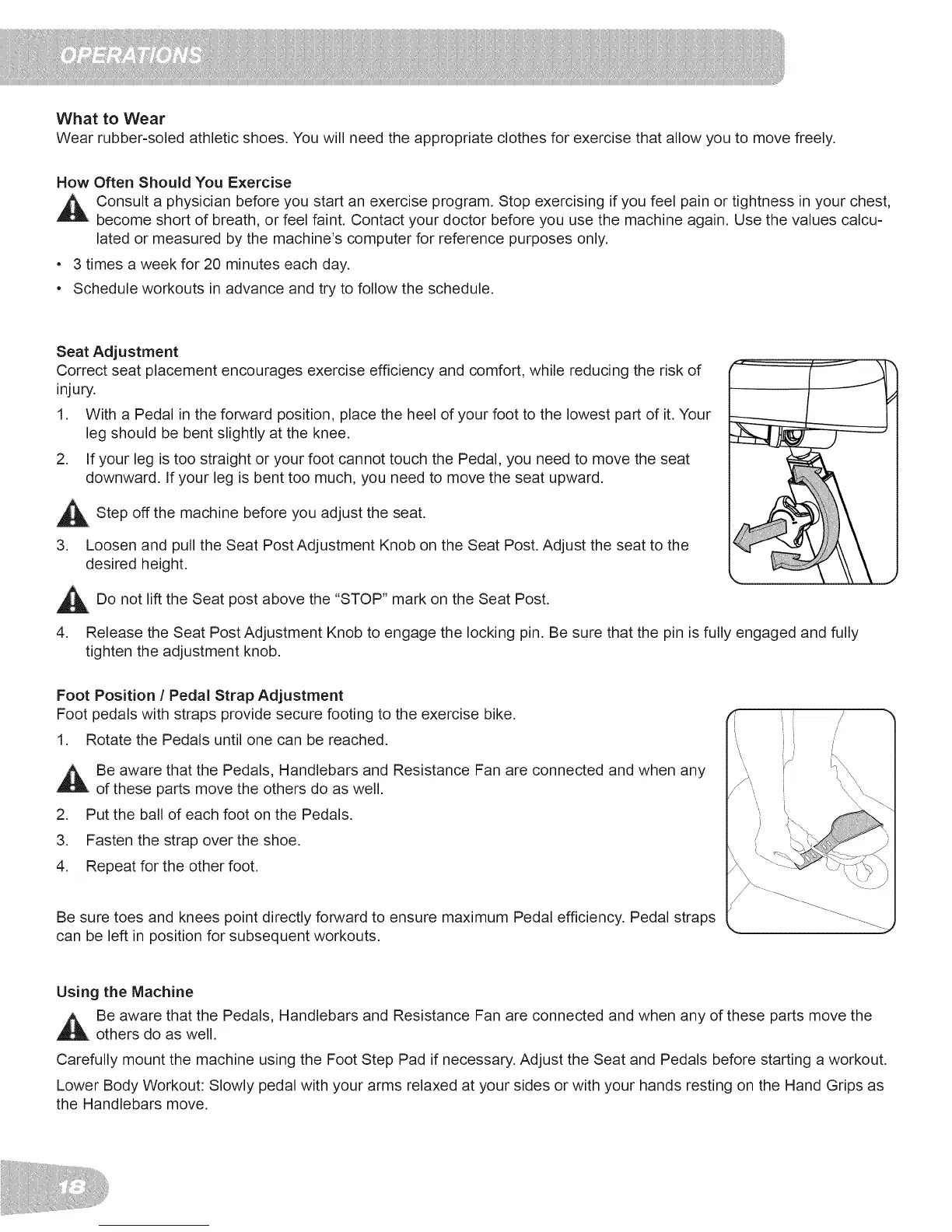 Carefully mount the machine using the Foot Step Pad if necessary. Adjust the Seat and Pedals before starting a workout.