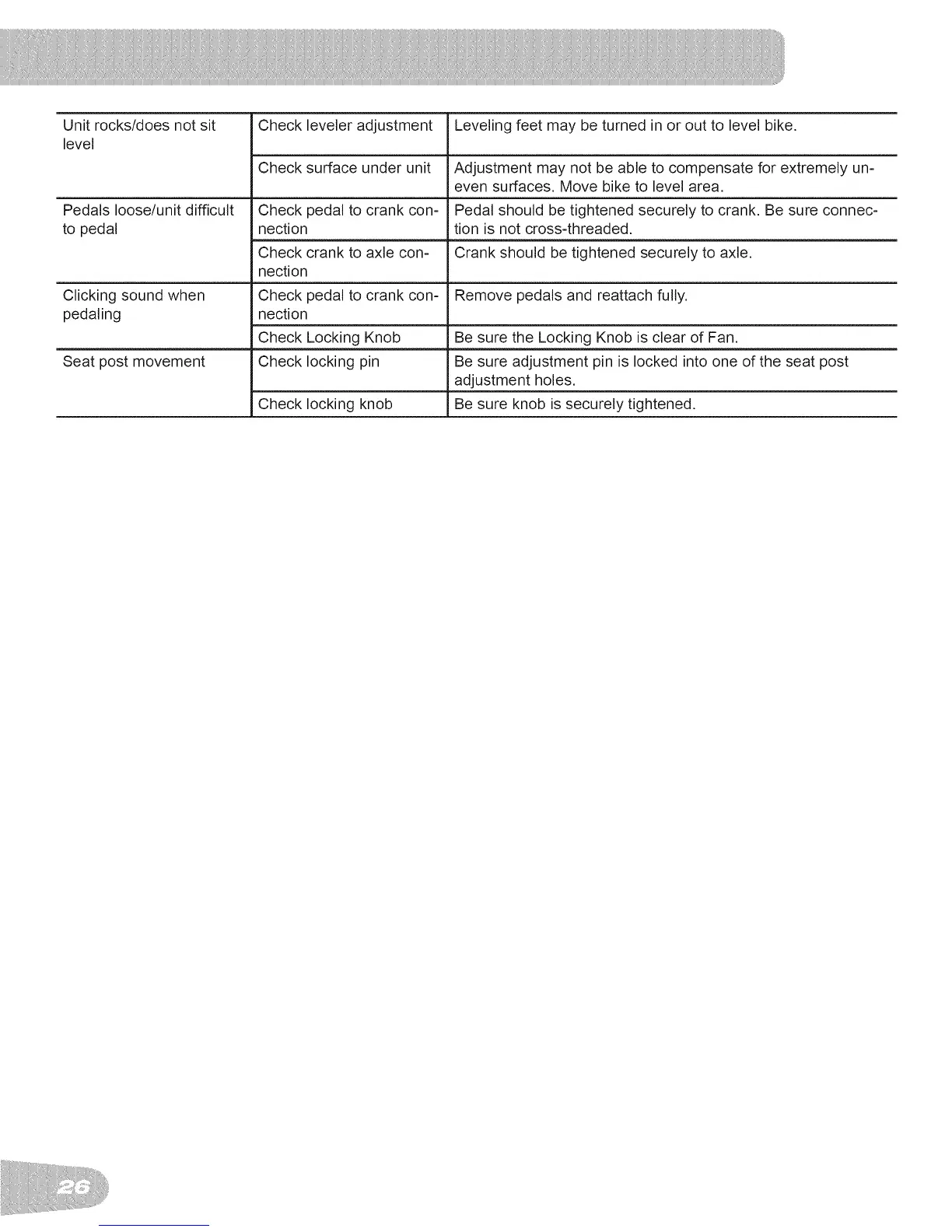 Pedalsloose/unitdifficult Checkpedaltocrankcon- Pedalshouldbetightenedsecurelytocrank.Besureconnec-