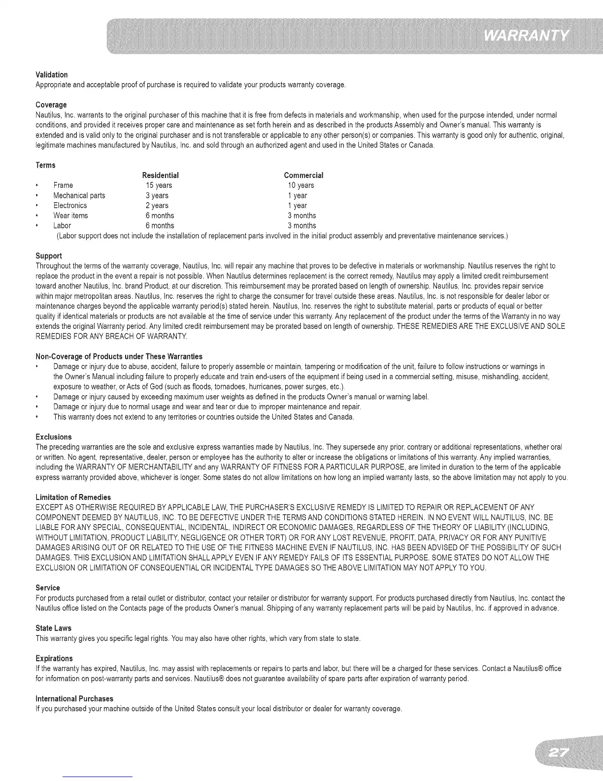 Throughoutthe terms of the warranty coverage, Nautilus, Inc.will repairany machine that provesto be defective in materials or workmanship. Nautilus reserves the right to