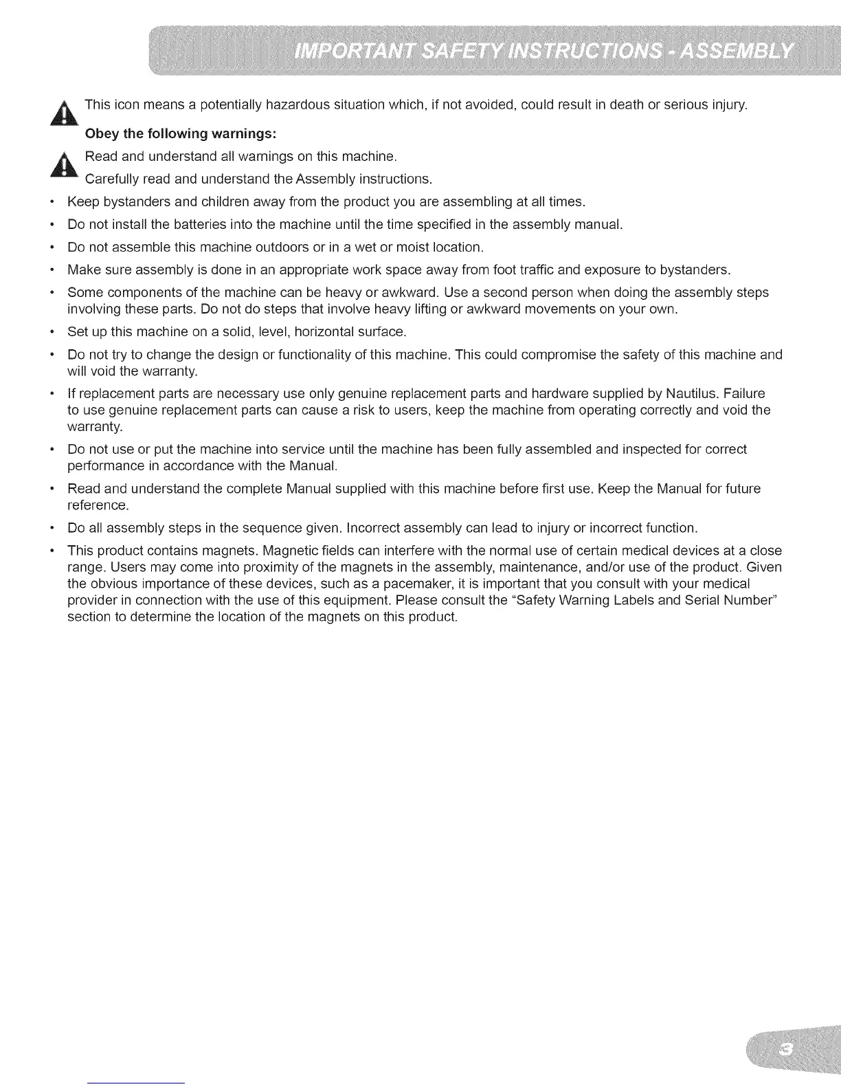 • If replacement parts are necessary use only genuine replacement parts and hardware supplied by Nautilus. Failure
