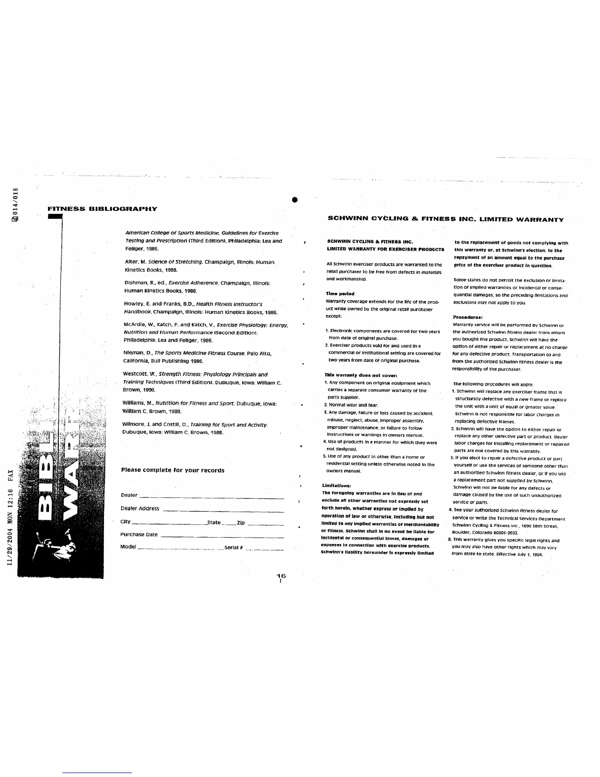 Schwinn Airdyne Backdraft - Fitness Bibliography; Schwinn Cycling Warranty