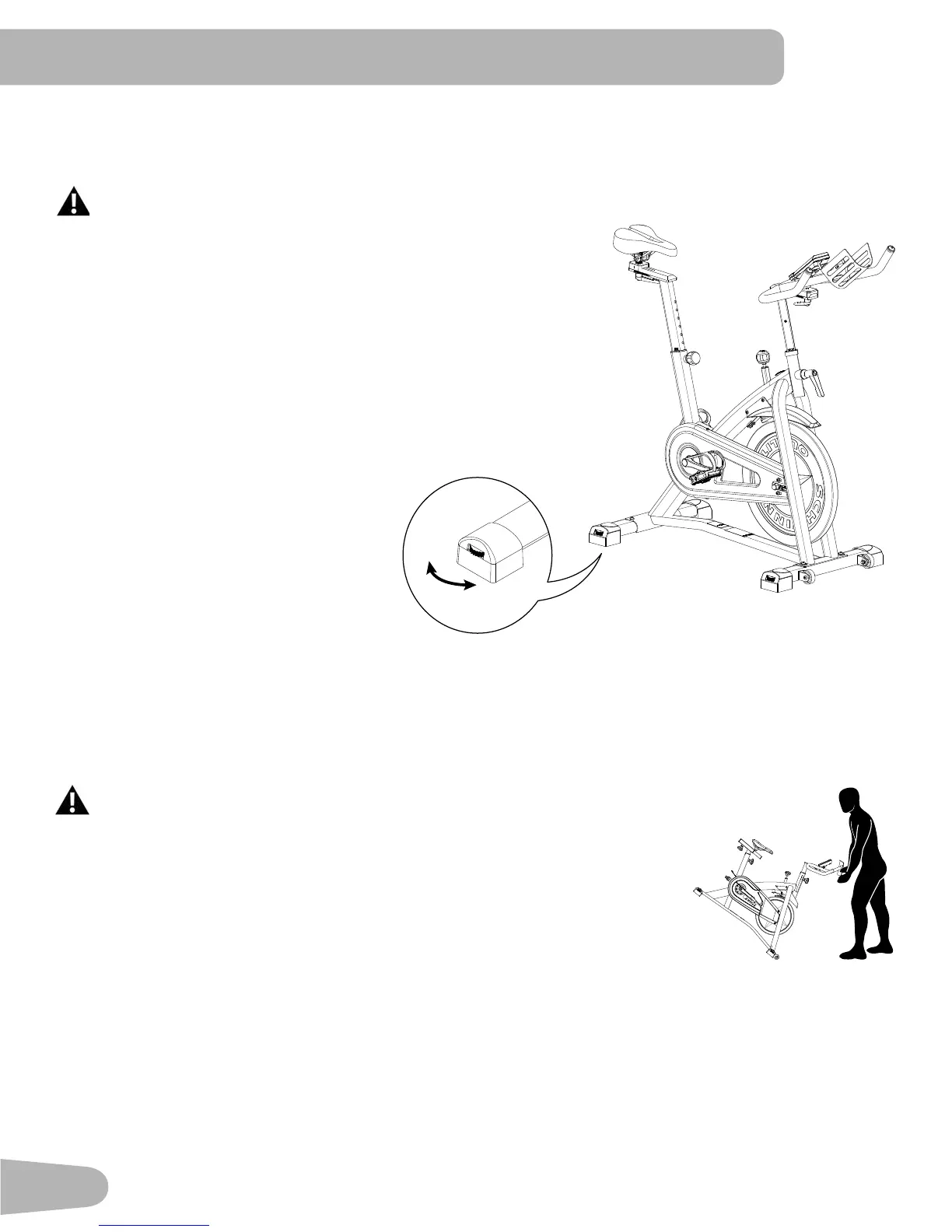 To move the bike, carefully pull the Handlebars toward you while pushing the front of the bike downward. Push the bike to