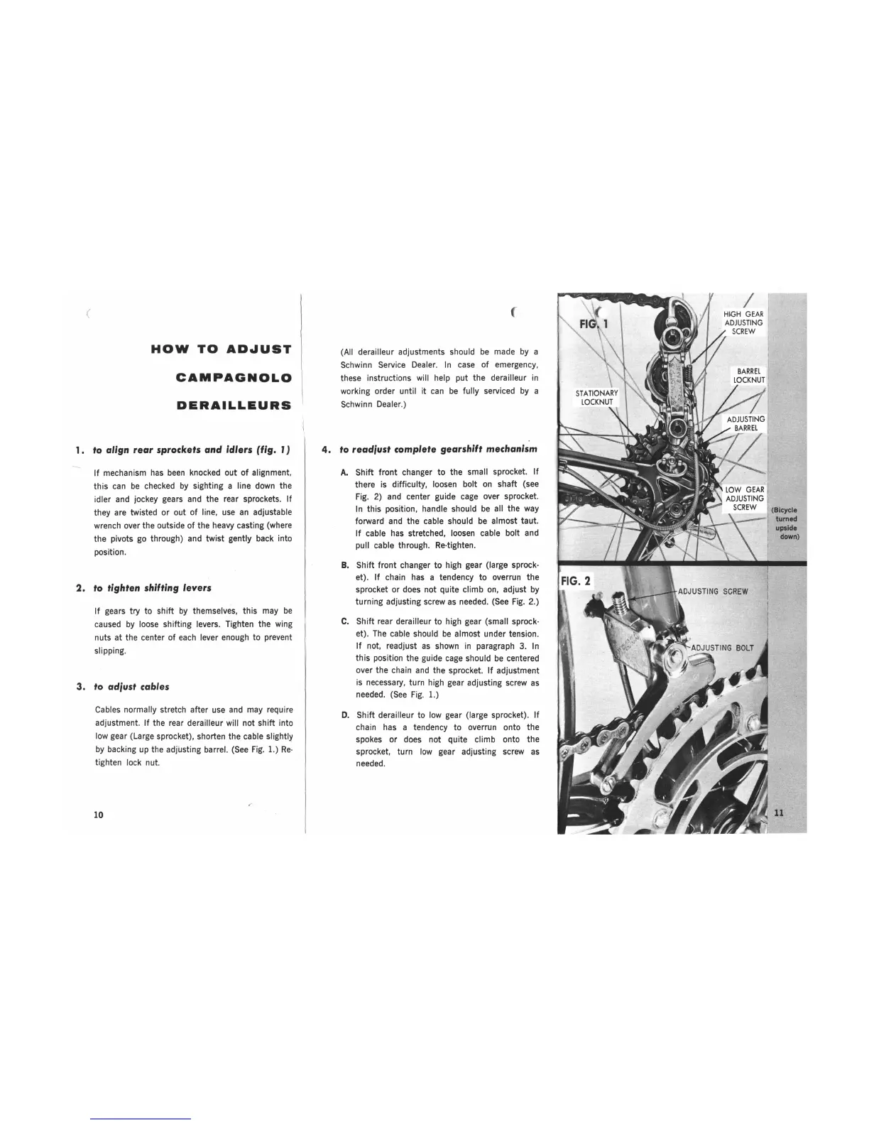 Schwinn Paramount - HOW TO ADJUST CAMPAGNOLO DERAILLEURS; to align rear sprockets and idlers; to adjust cables; to readjust complete gearshift mechanism