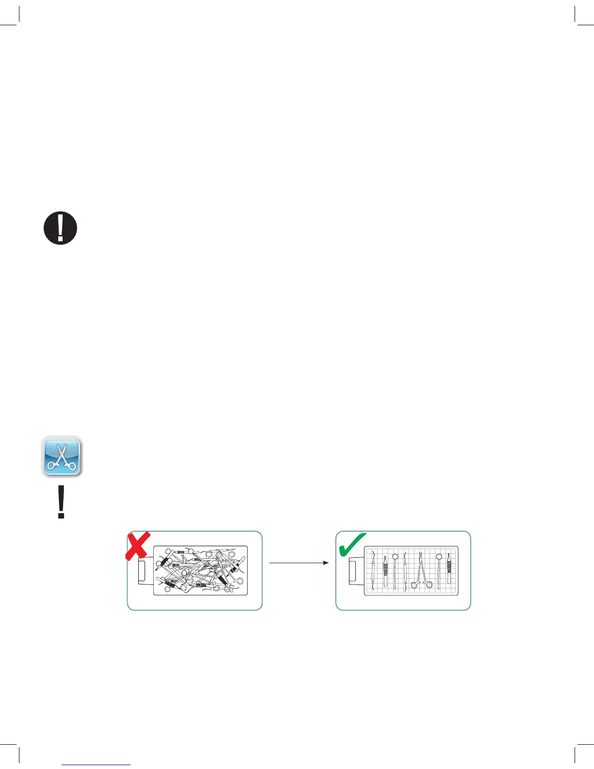 Instruments must not be stacked or piled in the cassettes, as this will impede the sterilization process.
