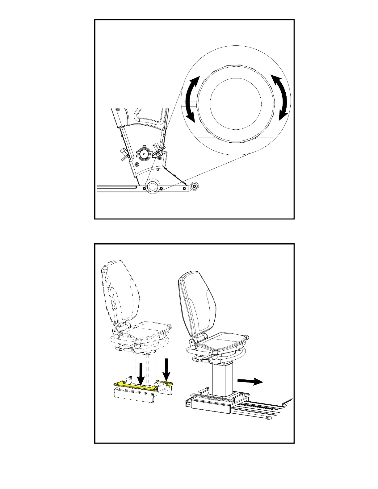 4. Remount the seat assembly by pressing either the left or right yellow foot levers, then slide the seat assembly onto
