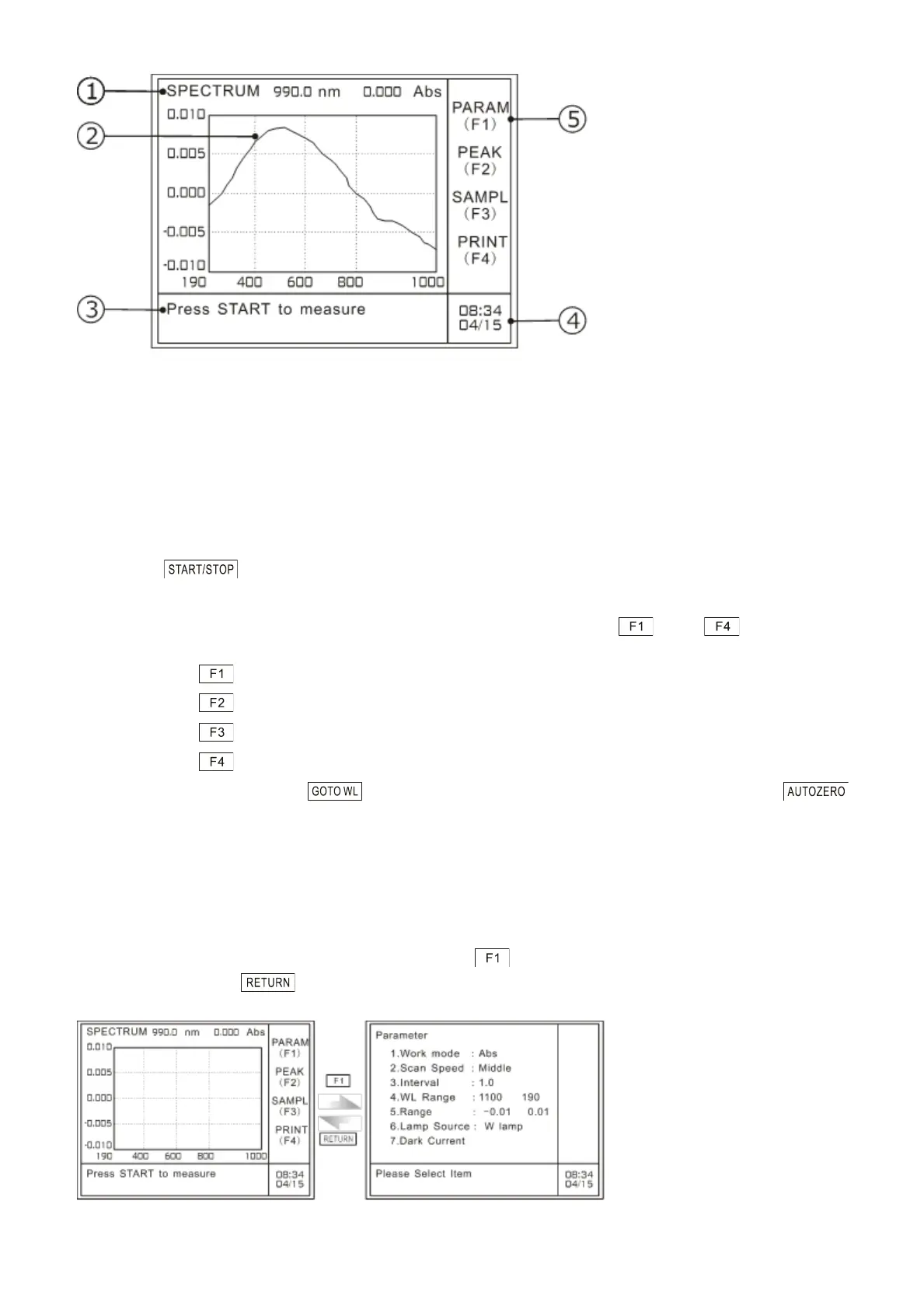 ① “SPECTRUM” here means spectrum scanning, current working mode;“990 nm”refers to