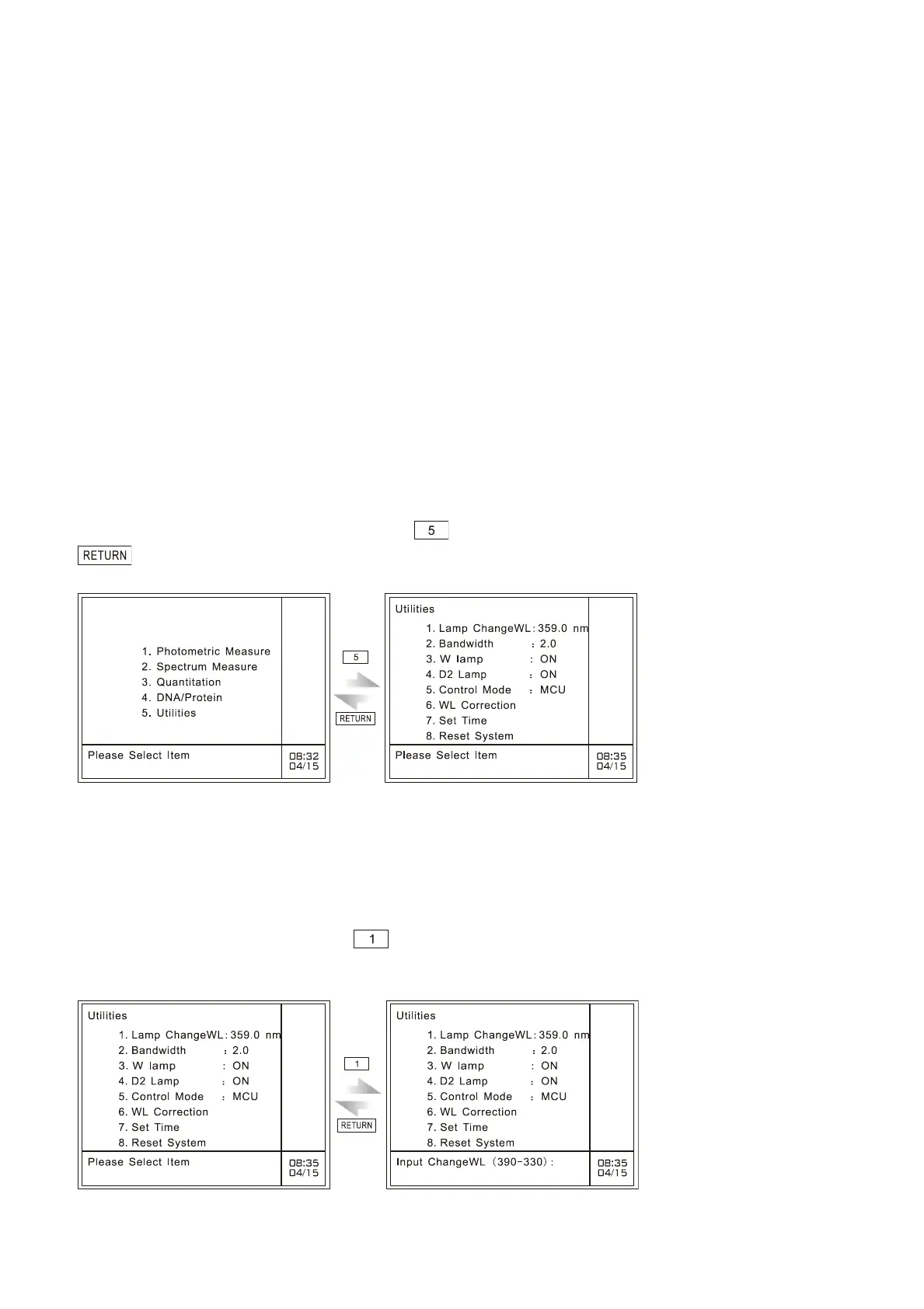 In the case of instrument main menu, press key to gain access to utilities mode, and press