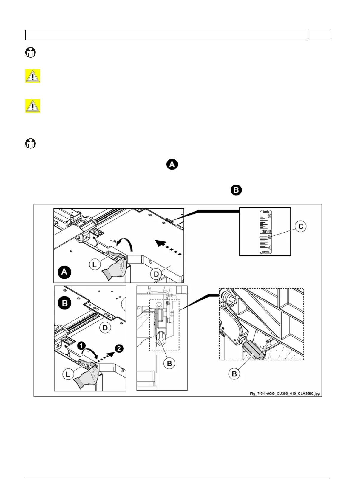 - Operate on the handle (B fig. 7.6-1) in order to place the table (D fig. 7.6-1) depending on the chosen removal: