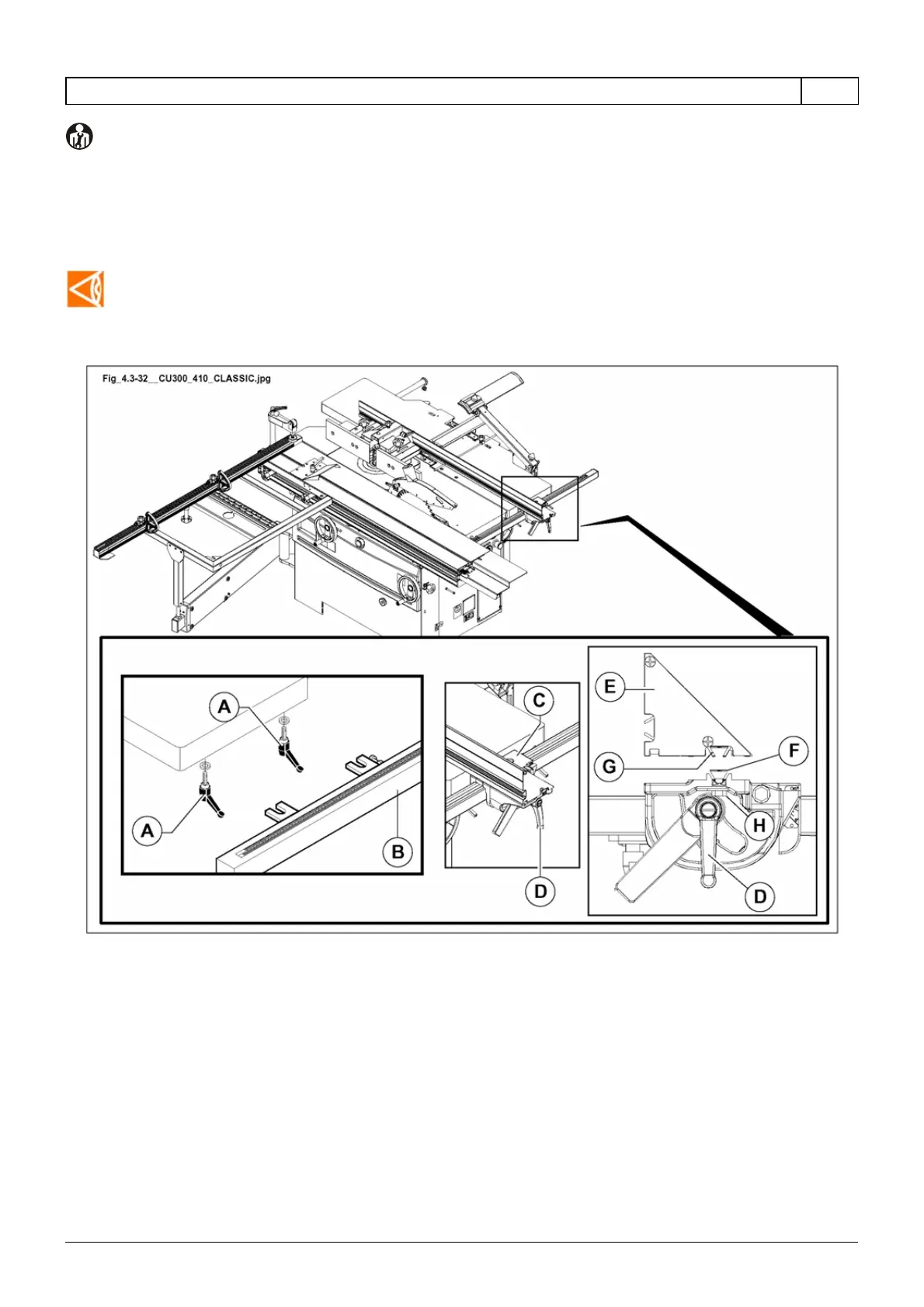 3) Fit the fence (E fig. 4.3-32) inserting the wedge (F fig. 4.3-32) in slot (G fig. 4.3-32) and tighten the nuts (H
