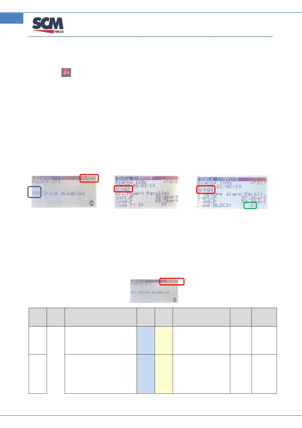 Here below some details about how to interpret the different codes shown in the alarm masks.