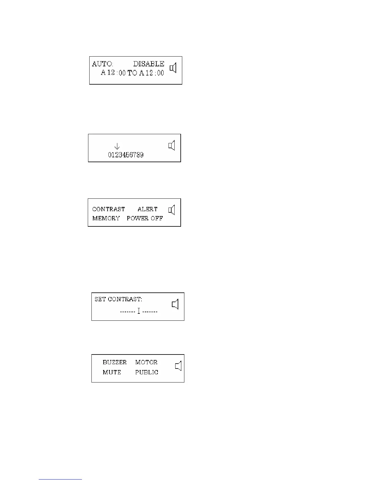 II) Press “Left” or “Right” key to select CONTRAST, ALERT, MEMORY or POWER OFF.