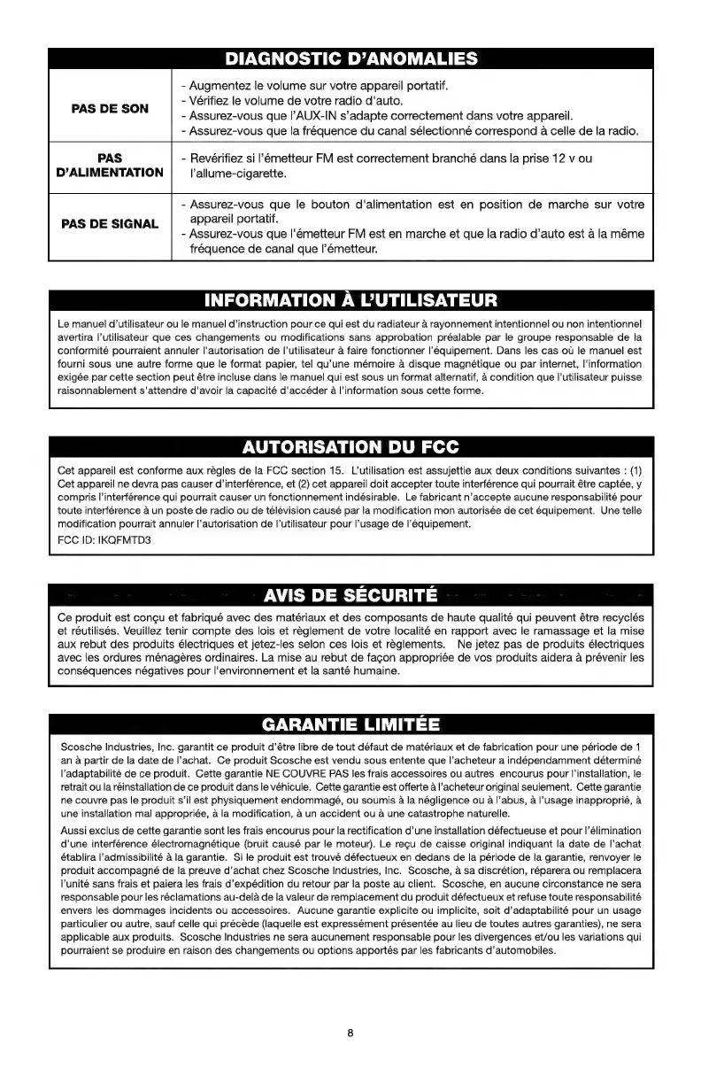 Scosche FMTD3 - Diagnostic Danomalies; Avis de Sécurité; Garantie Limitee