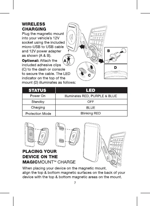 Scosche MagicMount MQ2VP2 - Wireless Charging and Device Use; Powering the Mount; Device Placement and LED Status