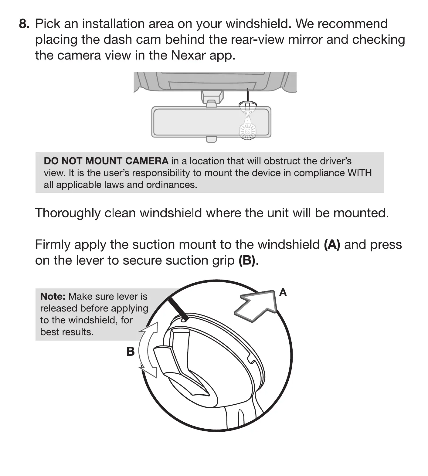 DO NOT MOUNT CAMERA in a location that will obstruct the driver's