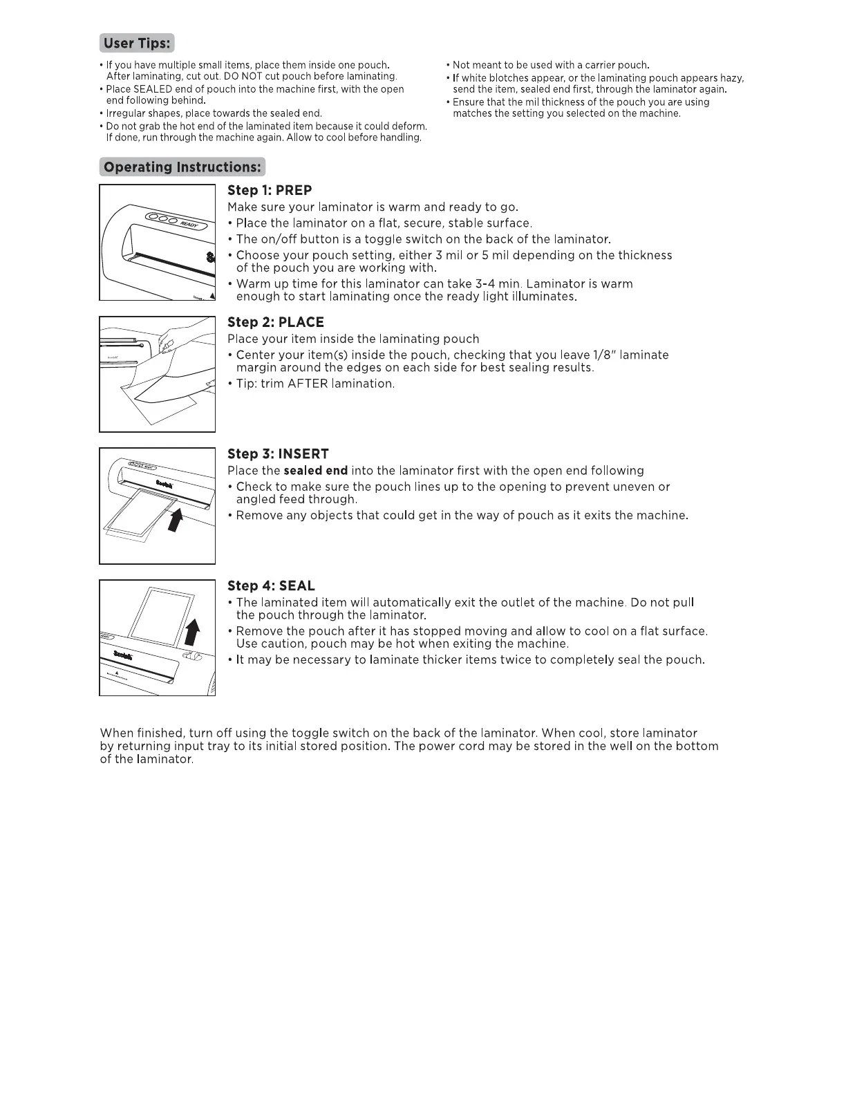 When finished, turn off using the toggle switch on the back of the laminator. When cool, store laminator