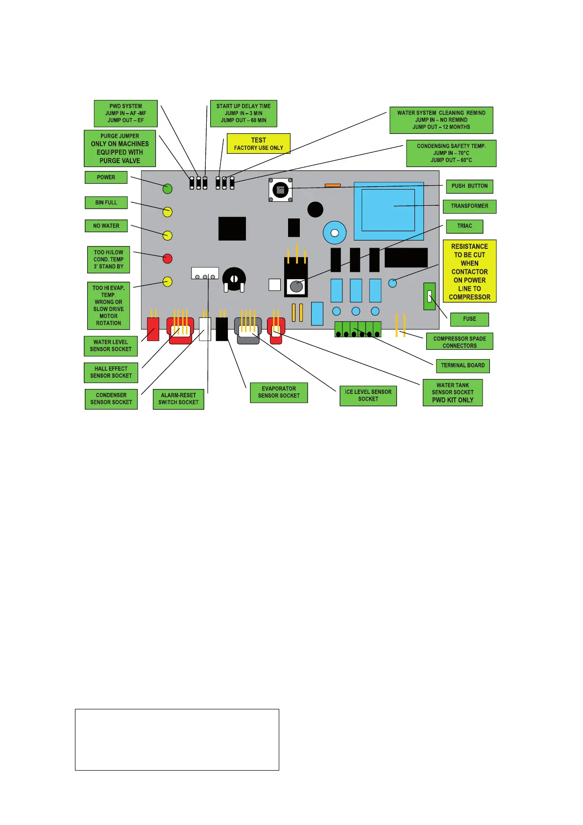 TO BY-PASS THE 3'/60' STAND BY TIME, SYMPLY JUMP "TEST" CONTACTS WITH PCB ENERGIZED