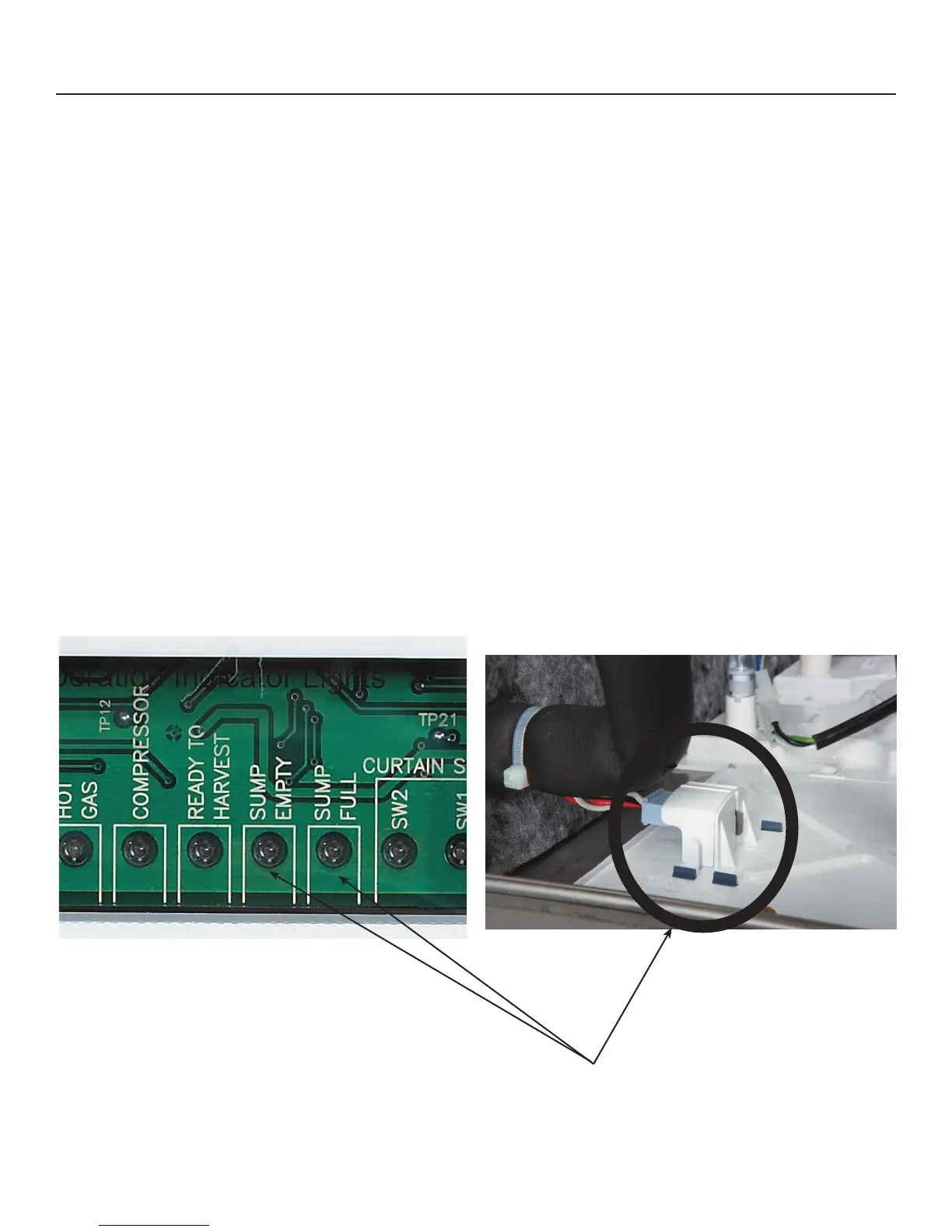 level sensor, the sump empty light should be ON. Jump harness wires white and black. The sump full light