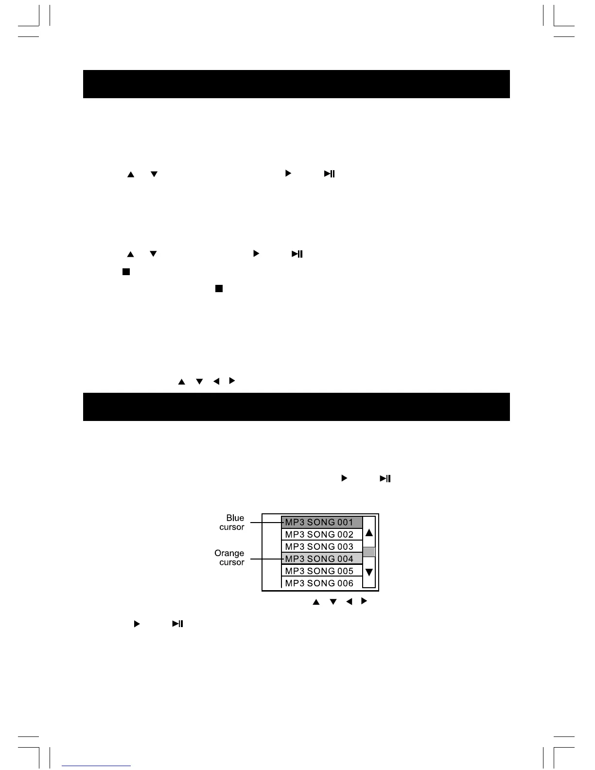 2. The MP3 menu shows a blue and an orange cursor. The blue cursor indicates the currently