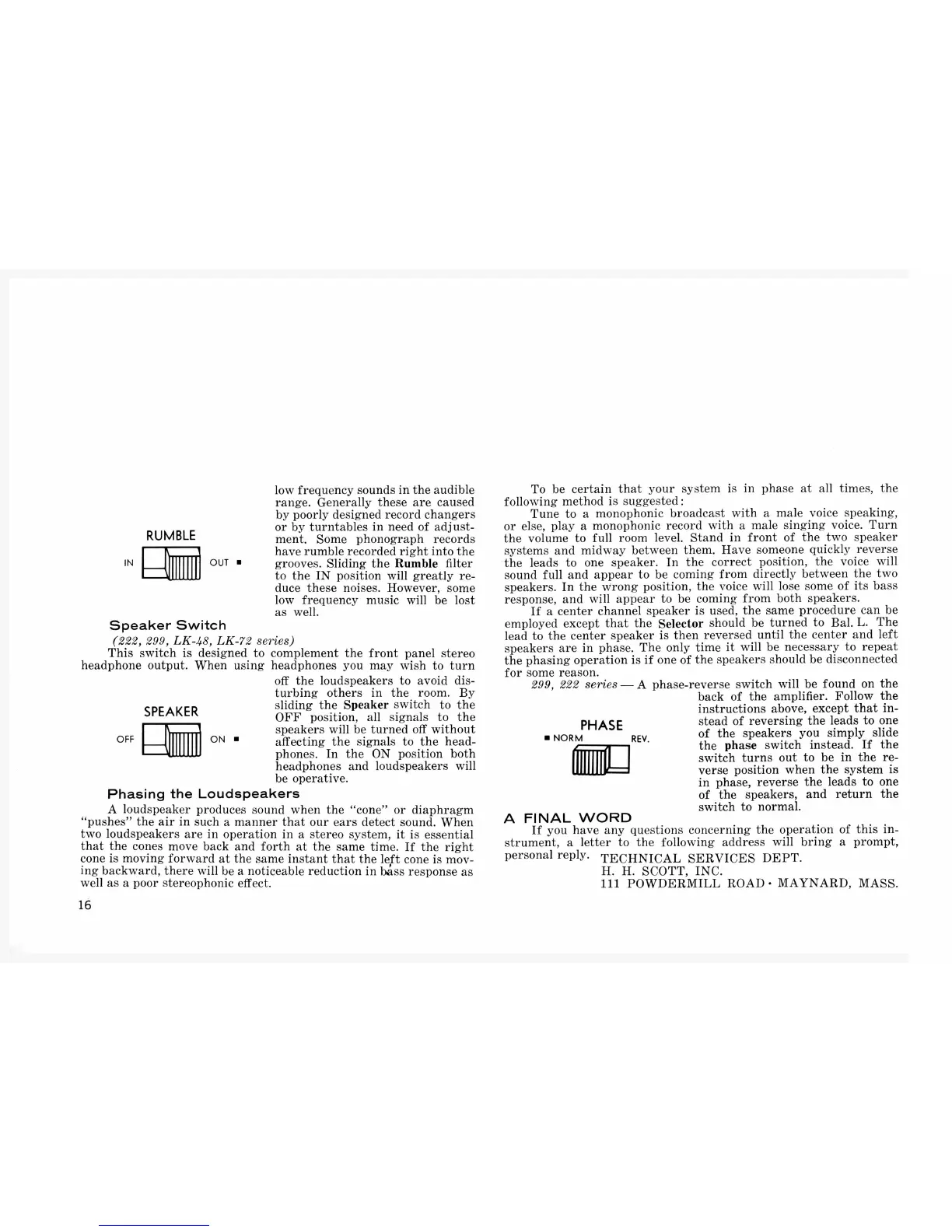 SCOTT Stereo Amplifier - Speaker Management and Customer Support; Speaker Switch and Phasing; Customer Service and Inquiries