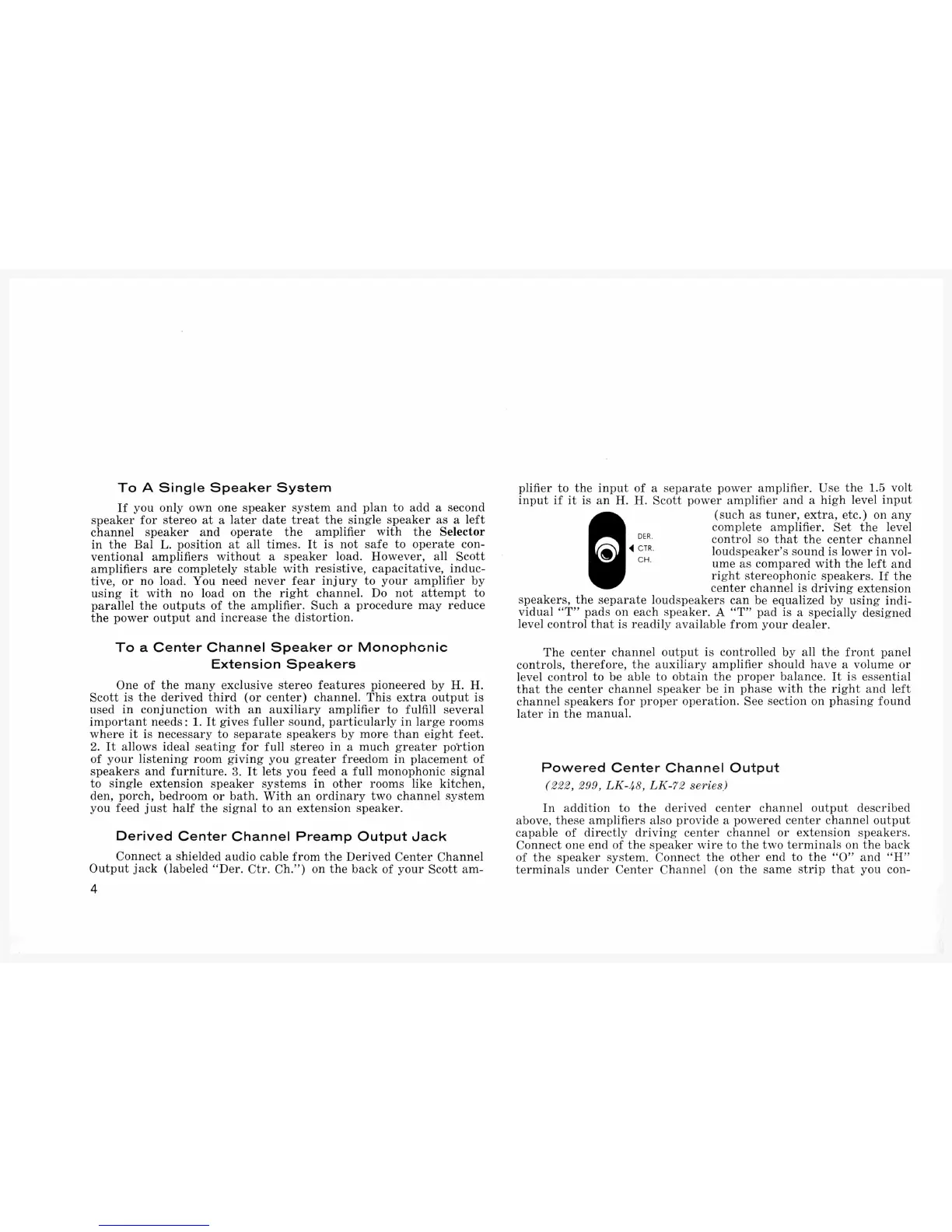 SCOTT Stereo Amplifier - Advanced Speaker Configurations; Single Speaker System Operation; Center Channel and Extension Speaker Setup