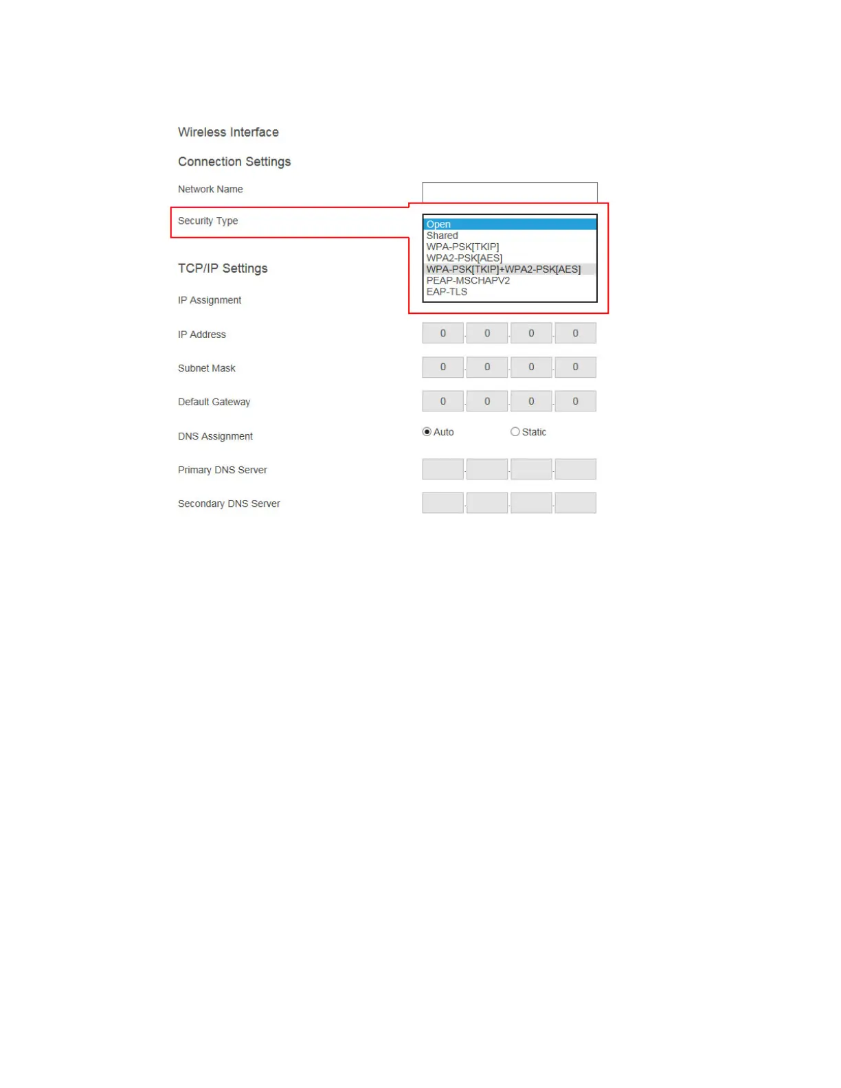 router. Available security types are Open, Shared, WPA-PSK[TKIP], WPA2-