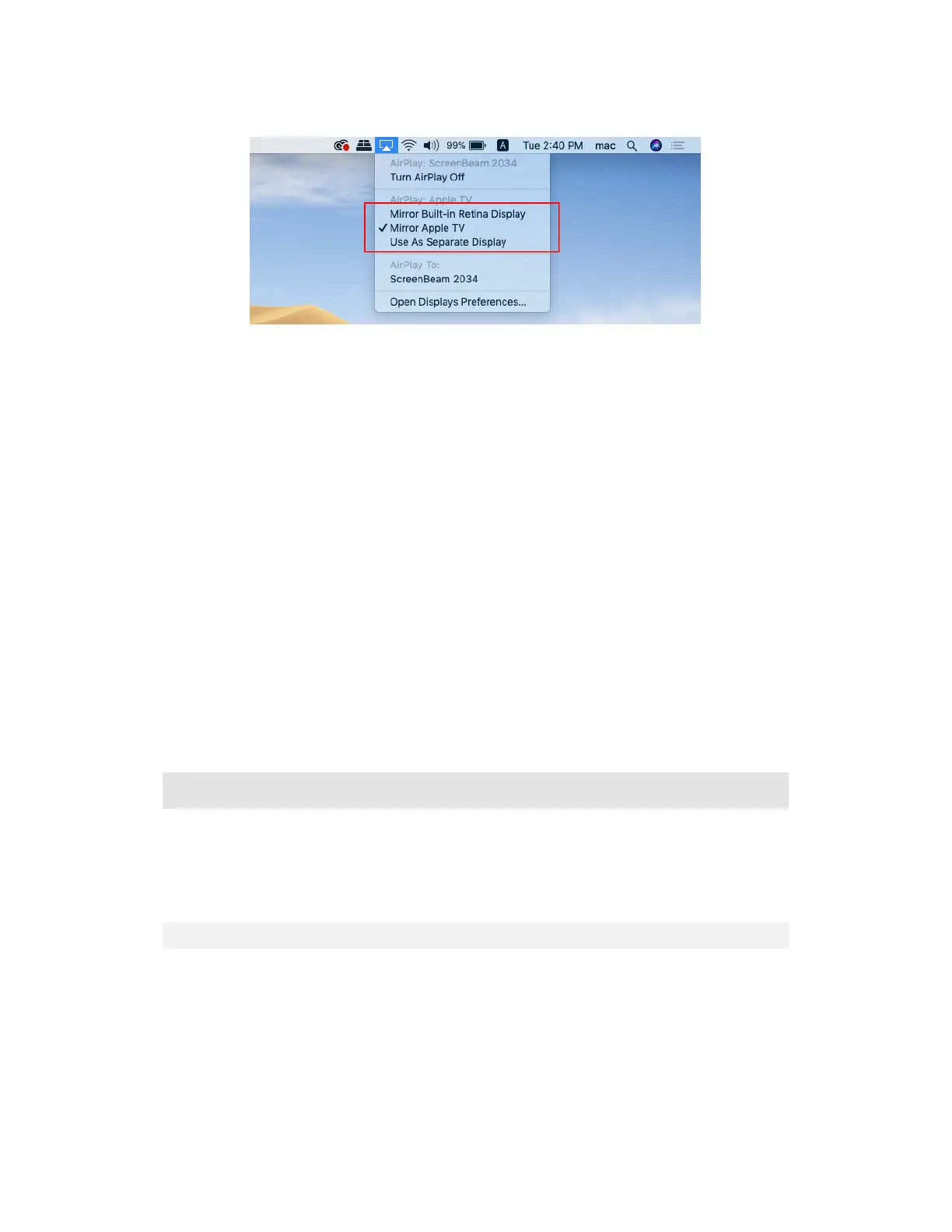 Built-in Display, Mirror Apple TV, and Use As Separate Display.
