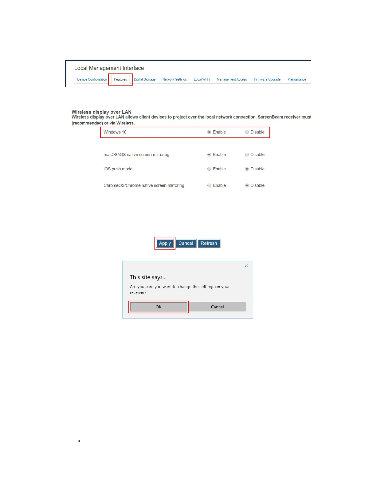 2. Go to the Wireless display over LAN section, and set Windows 10 to Enable or