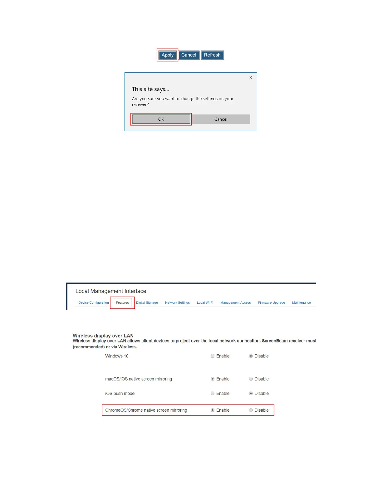 2. Go to the Wireless display over LAN section, and set ChromeOS/Chrome native