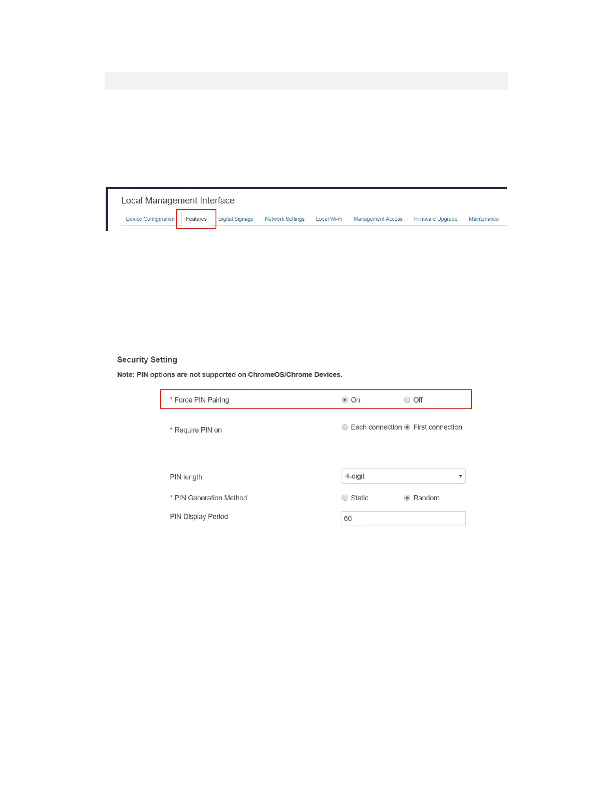 2. Go to the Security Setting section, and set the Force PIN Pairing feature to On or Off.
