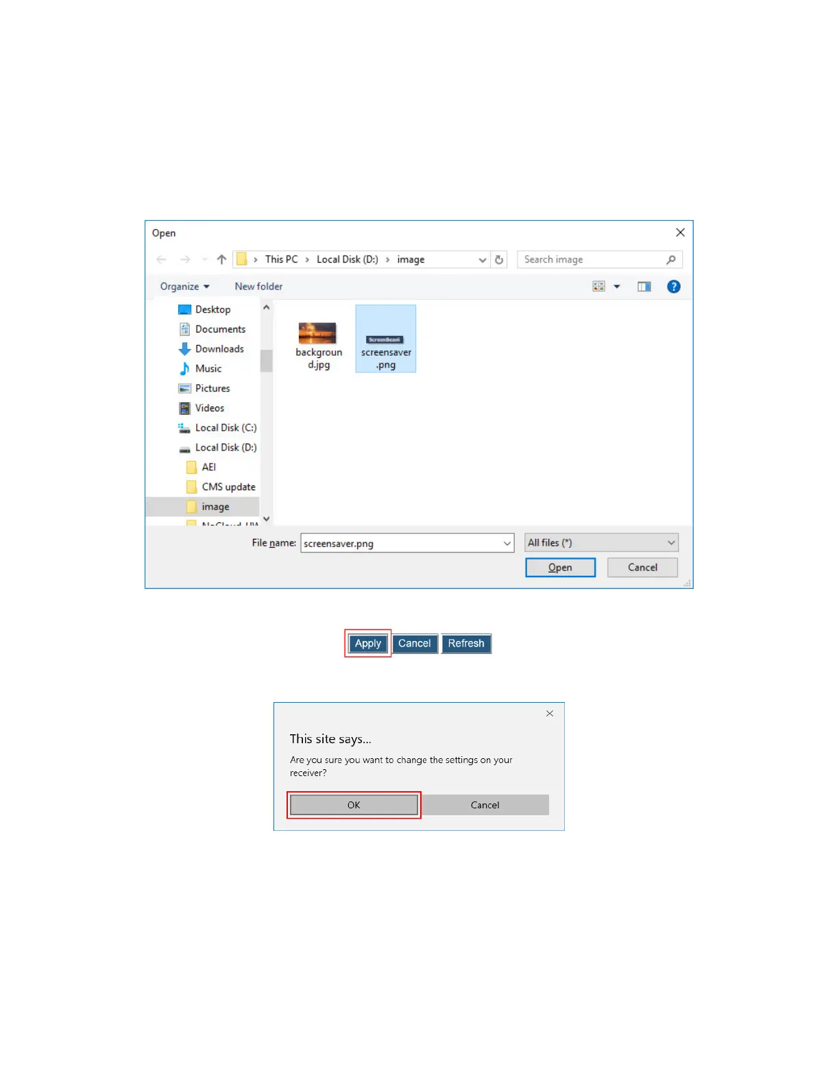 4. Click the Apply button to upload the screen saver image to the receiver.