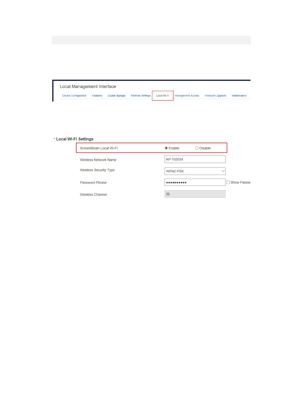 2. Go to the Local Wi-Fi Settings section, and set ScreenBeam Local Wi-Fi to Enable